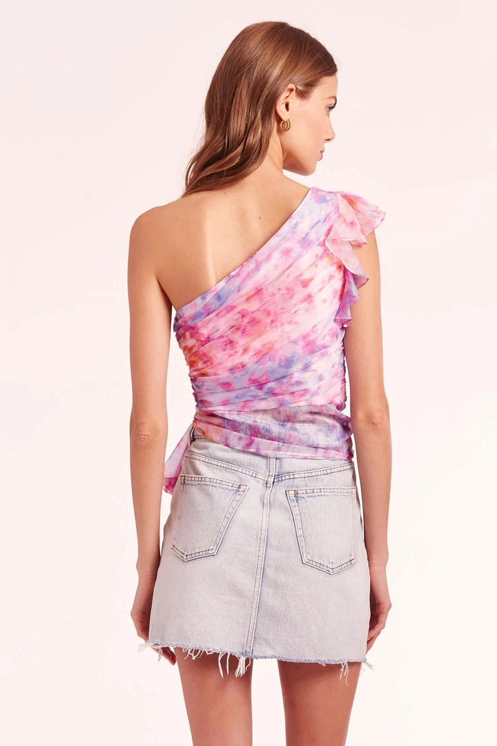 The one shoulder Bea Top is ready for your next date night. This top features ruffle sleeve detail, sash and tie detail at the front left side, and an invisible zipper at the left side. This top looks beautiful paired with jeans and kitten heels.