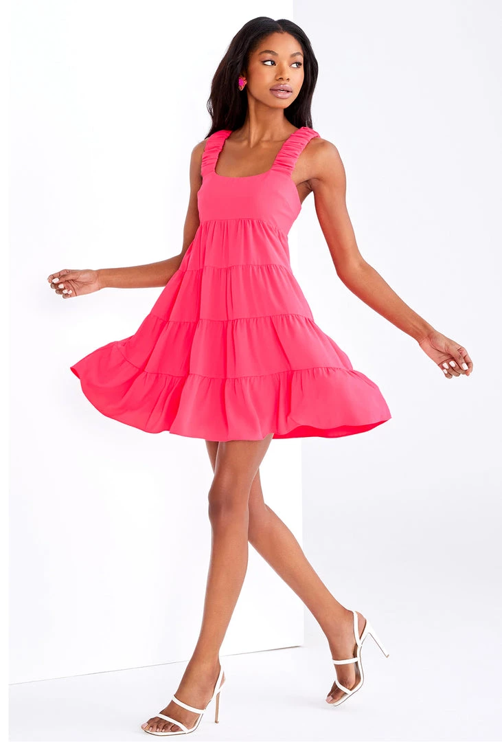 Skip the hassle of choosing an outfit and wear the effortlessly beautiful Nicolia Dress. This tiered mini dress features ruched strap detail with elastic inside, smocking at the side back, and an invisible zipper. Complete the look with sandals for your go-to outfit to wear tothe beach, farmers market, or on a picnic.