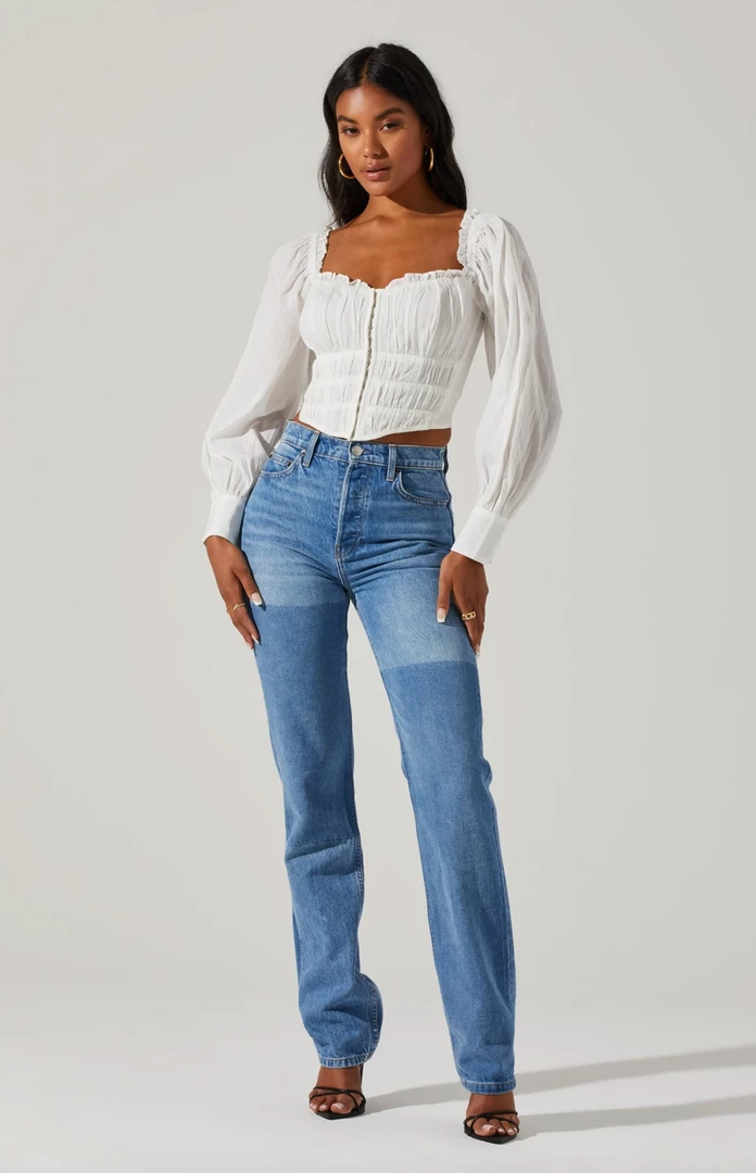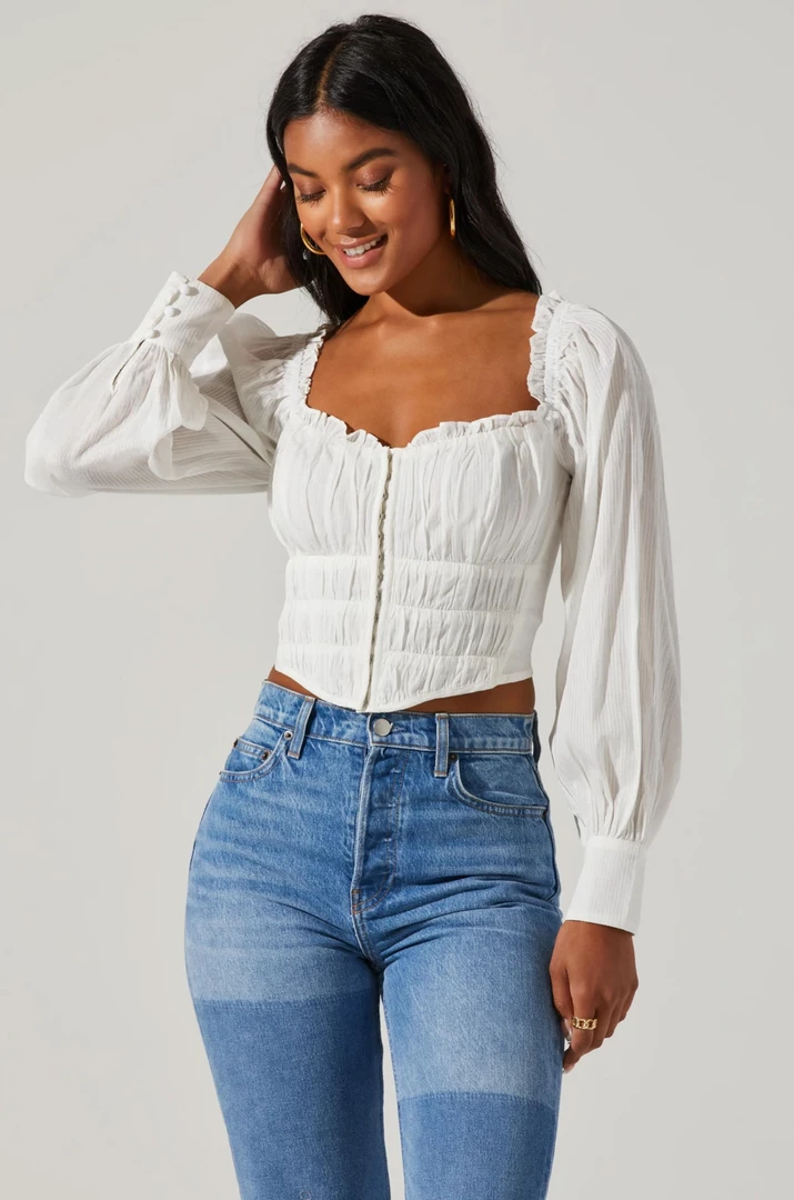 The Amber top features a square neckline with a ruffle trim. Shirred bodice features a hook-and-eye placket along the front. Long puff sleeves with buttoned cuffs. Smocked back.
