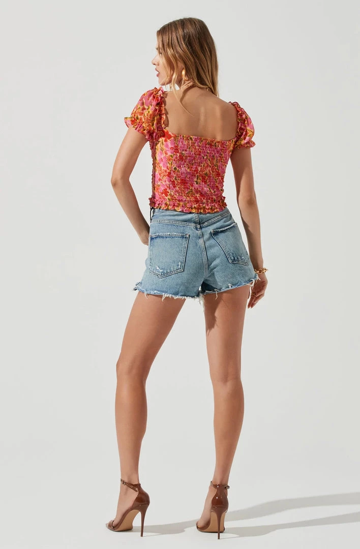 Keep it sweet in the Helena Top. It features a subtle sweetheart neckline with ruffle trim and an allover ruched design. Short sleeves. Smocked back.