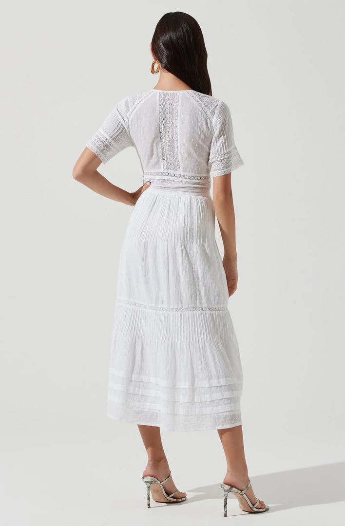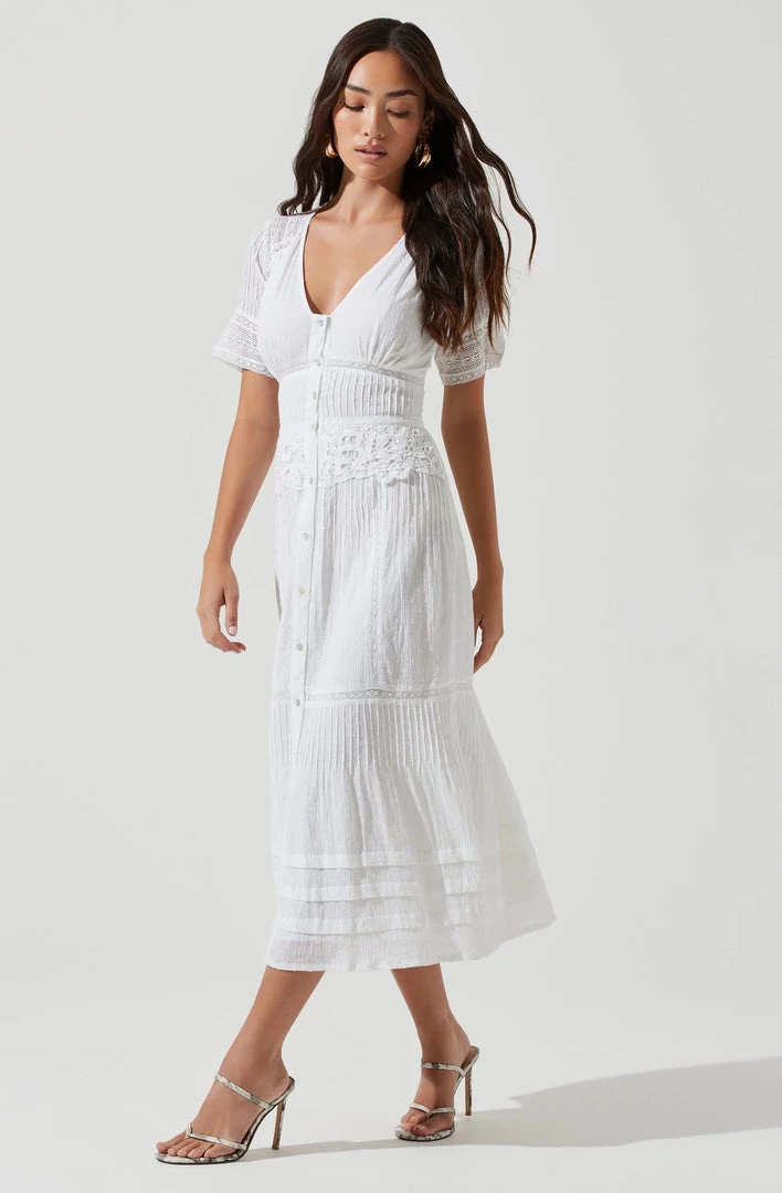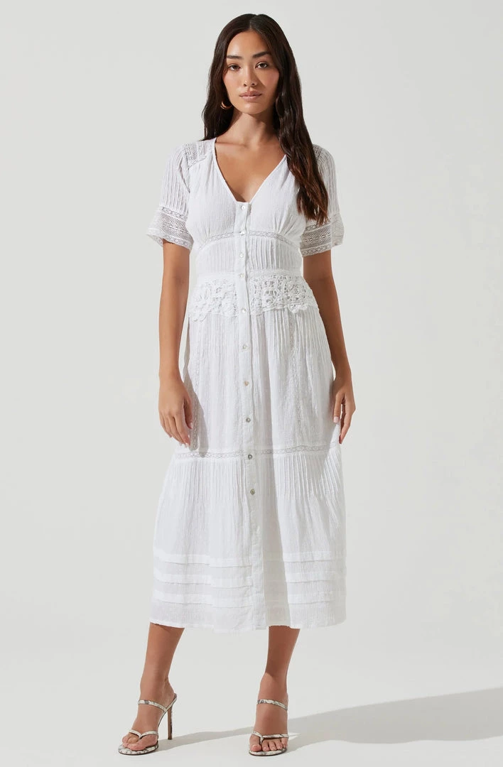 The Honeymoon Dress features a V neckline that leads to a buttoned front. Short sleeves feature semi-sheer lace trim. Lace details throughout the waist and hem. Short sleeves.