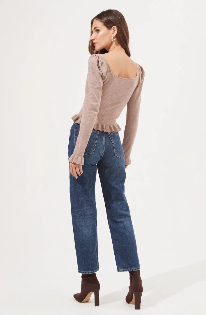 The Mattie Sweater features a sweetheart neckline with a cinched bust and drawstring accent. Long sleeves with ruffle cuffs and trim along the hem.