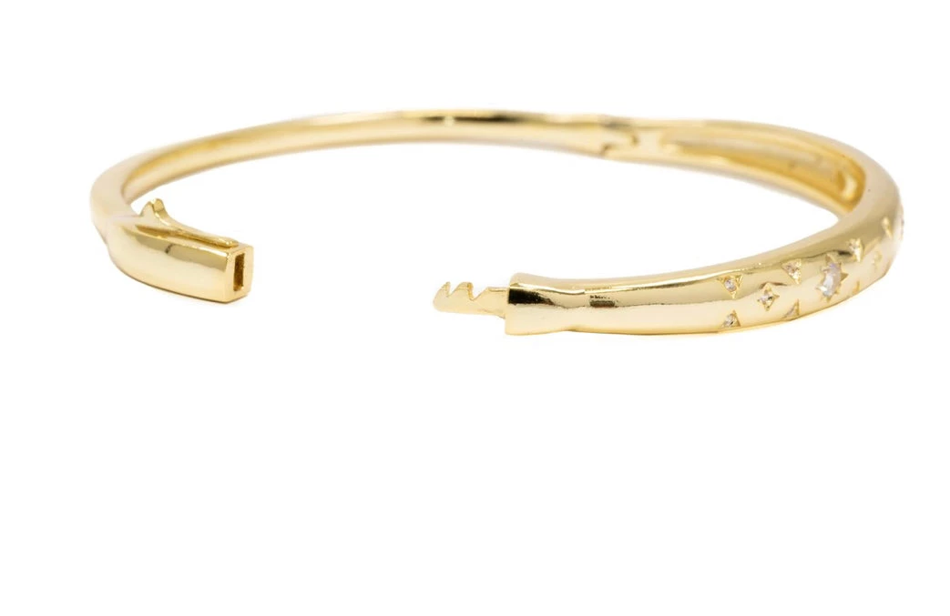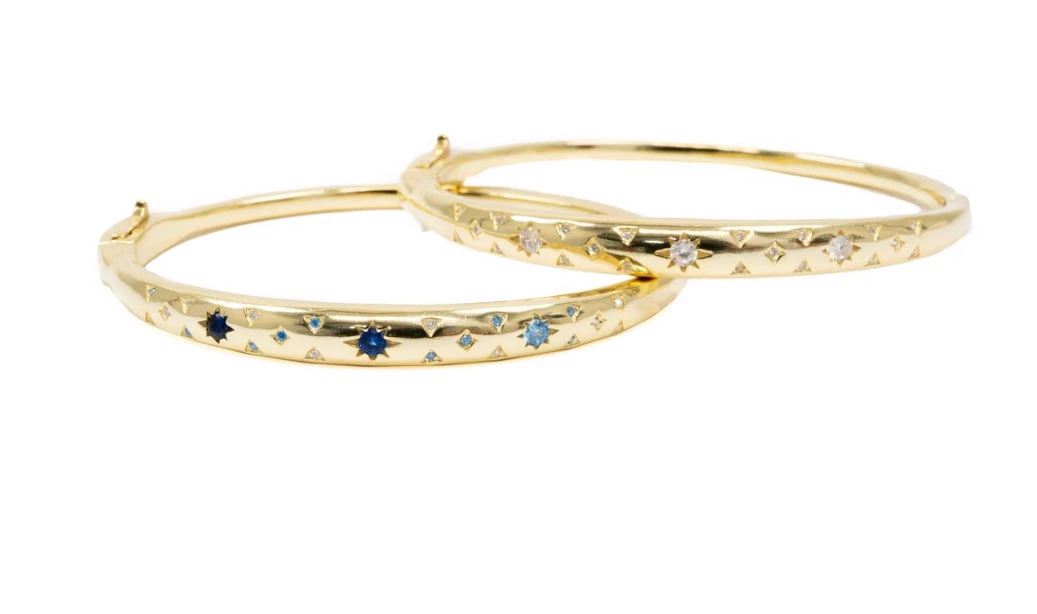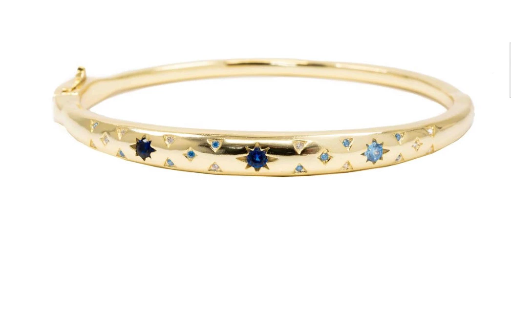 Starry golden cuff to remind you of our beautiful sky. 14k gold plated over sterling silver with white or sapphire cubic zirconia