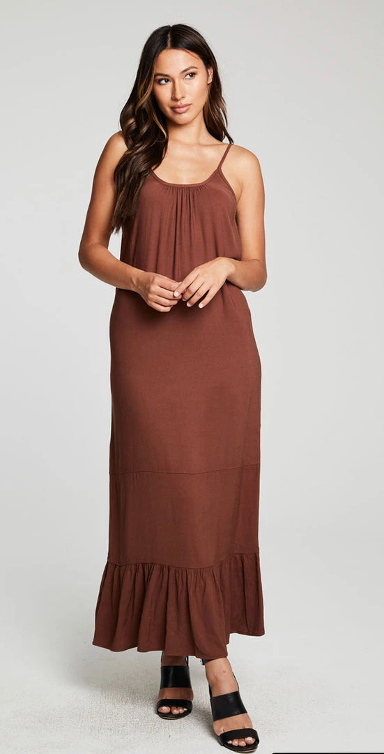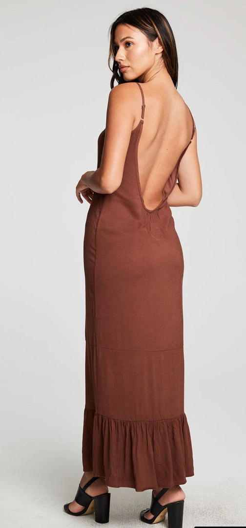 Our Heirloom Wovens Tiered Low Back Maxi Sundress features a thick ruffled tier at the hemline for added flair.