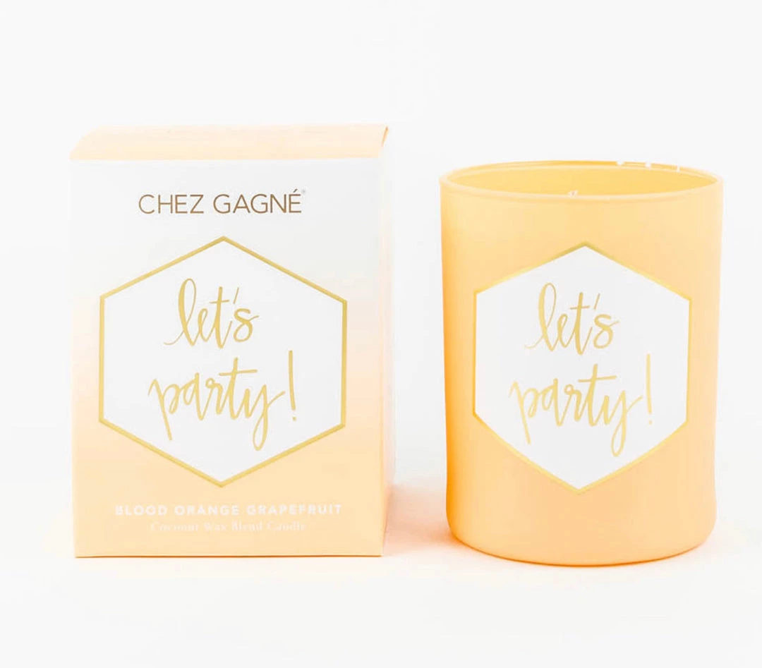 Blood Orange Grapefruit Scented 11oz Candle in a 14oz Sunset Orange Painted Glass Vessel; Decorative Foil Printed Adhesive Label with message “Lets’ Party”