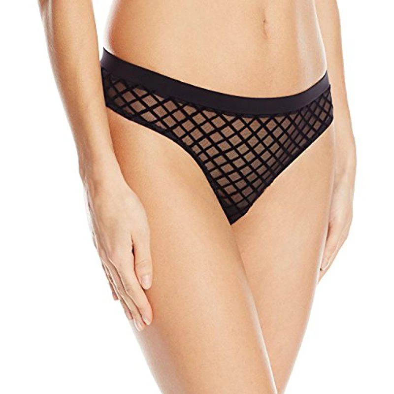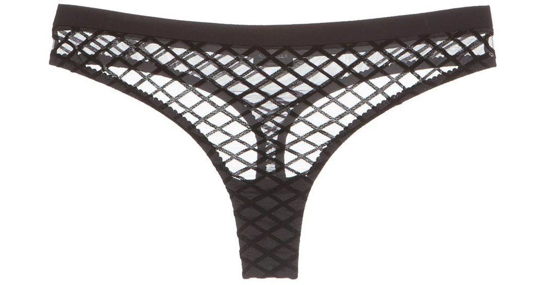 A velvet grid accents this sheer mesh Cosabella thong. Elastic waistband and lined gusset.