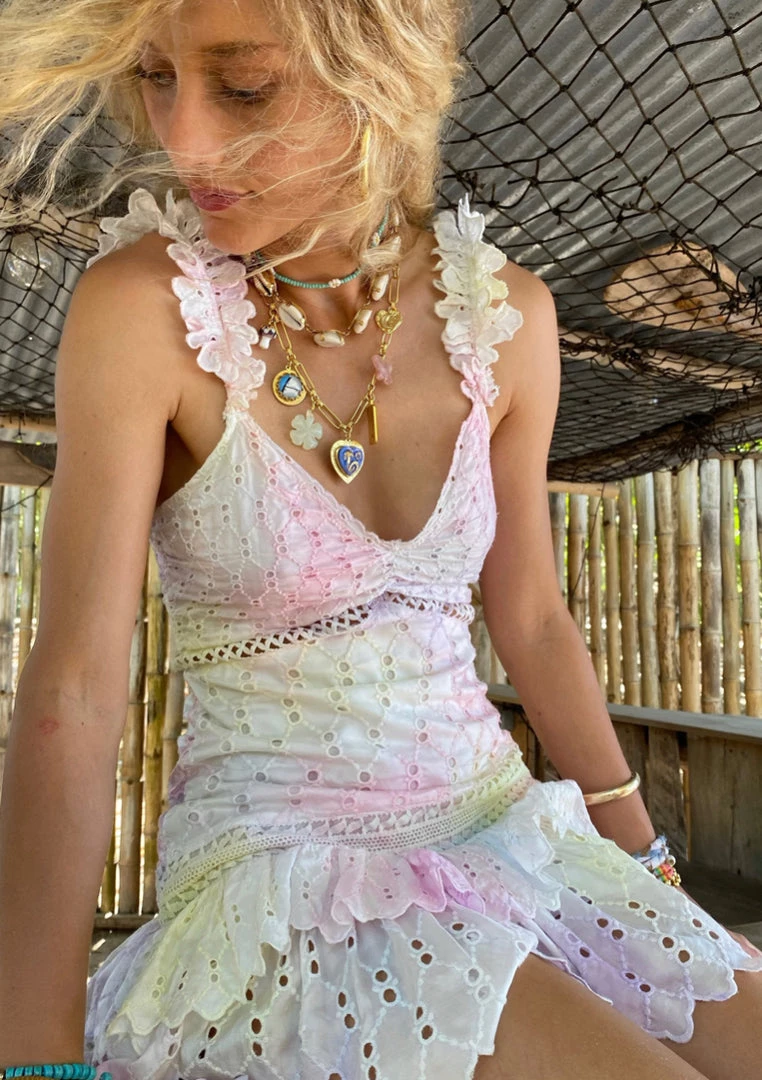 New this season, our Desra Dress debuts in 100% hand-dyed silk with a mix of dot and leaf eyelet at different scales. This mini frock has ruffle-trimmed straps, a v-neck and a cinched bust above an intricate open lace panel. The fitted body extends to an asymmetrical drop-waist with one shaped and one leveled scallop-edged tier. Invisible zipper at wearer’s left.