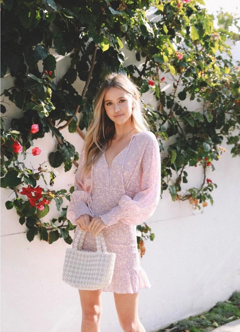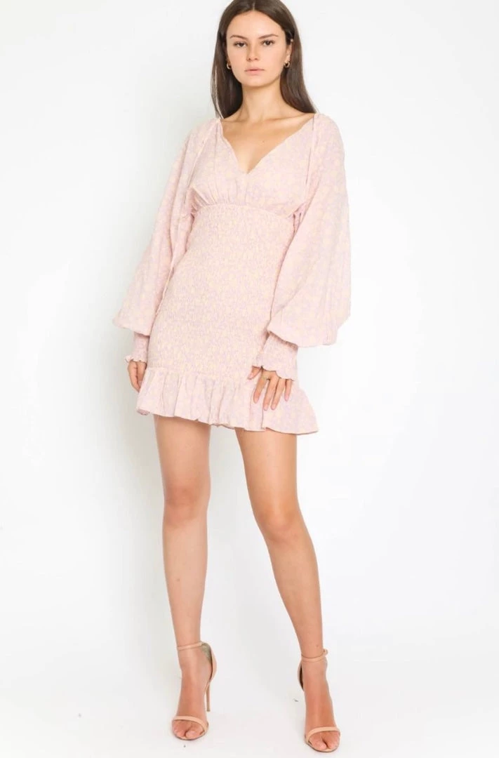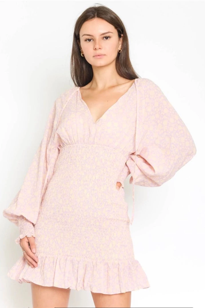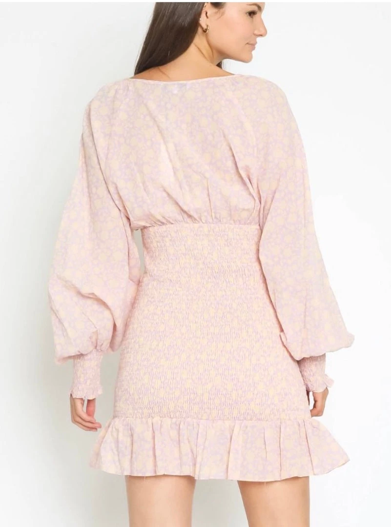 This lavender smocked dress features bubble sleeves and a ruffled hem.