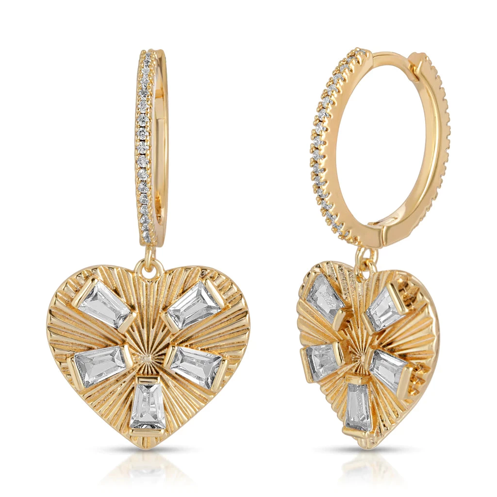 These romantic earrings bring all the glamour with CZ-studded hoops and a dangling Modern Love heart and baguettes.