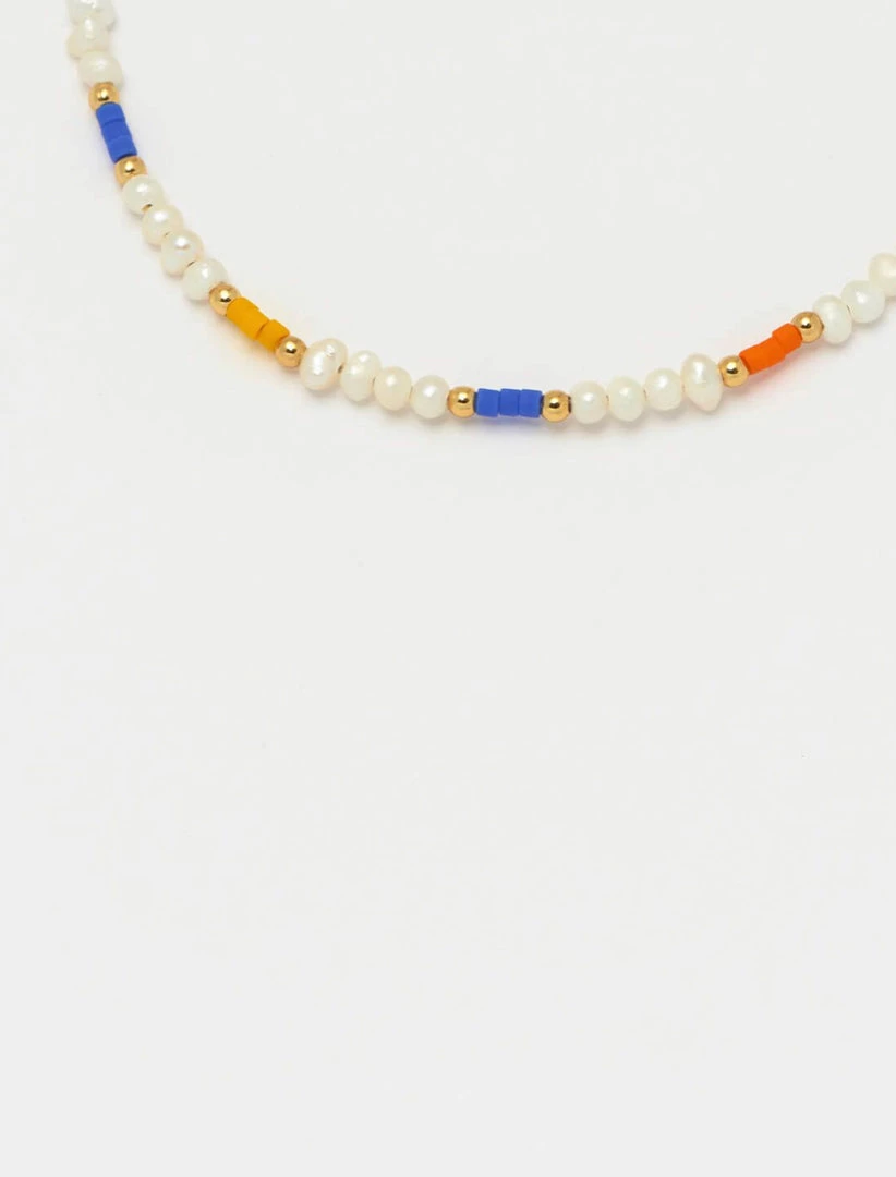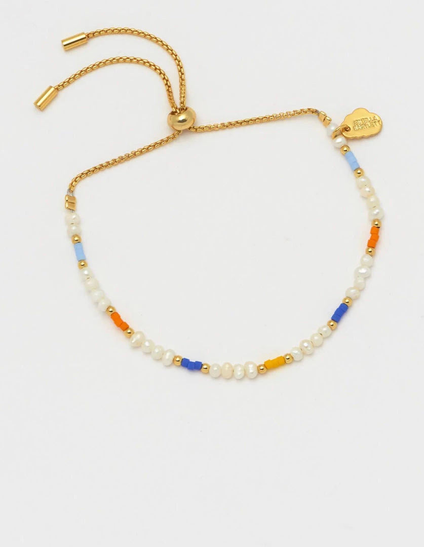 A subtle ode to the beauty of the ocean, this Pearl and Colour Pop Beaded Slider Bracelet features elegant seed pearls perfectly complemented by an array of coral and aqua Miyuki beads, all resting on a delicate gold plated chain.