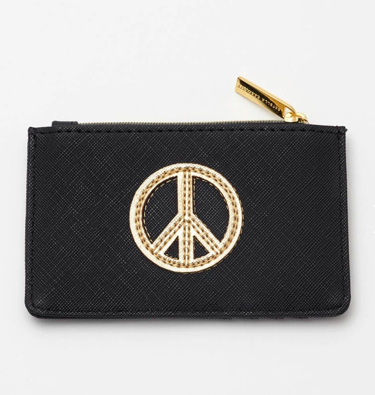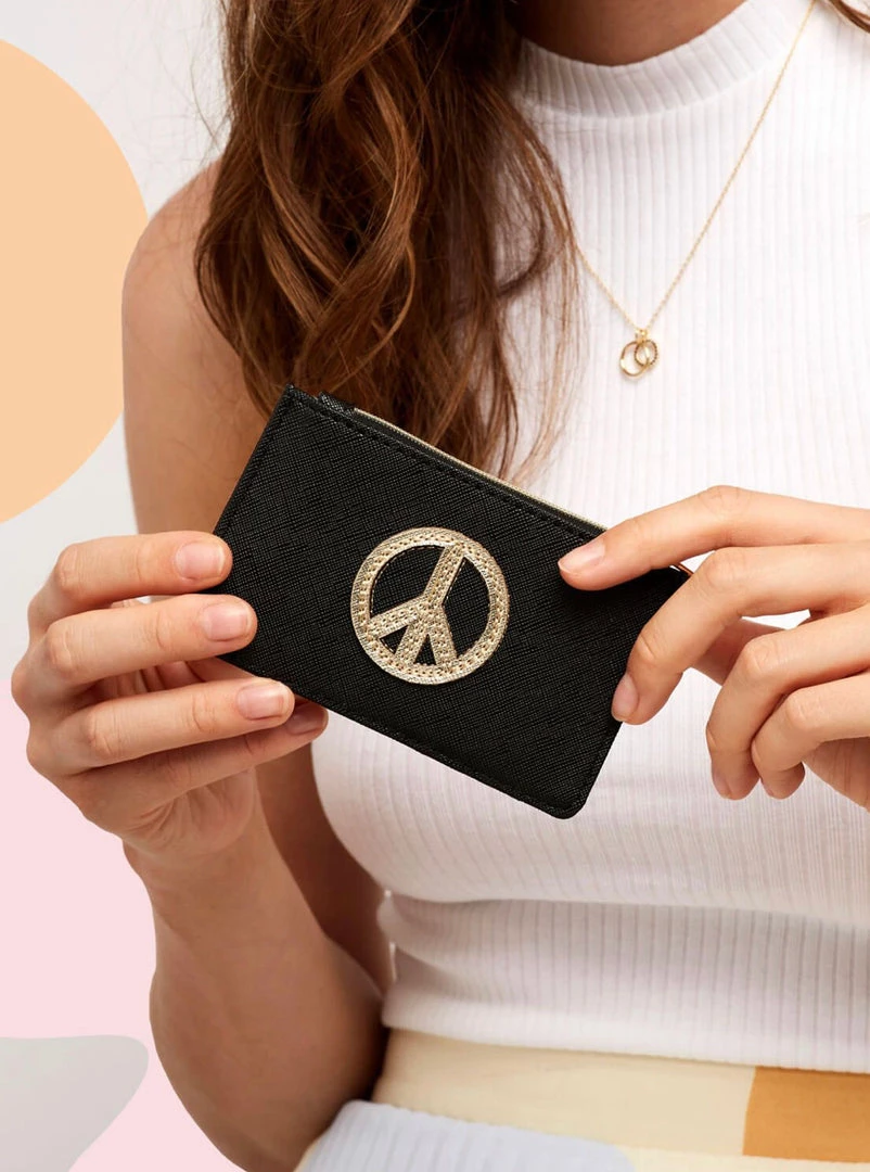Peaceful vibes abound with this beautifully appliqued card purse. The iridescent purse is enhanced by bold applique in gold, allowing you to carry all of your essentials together in style.