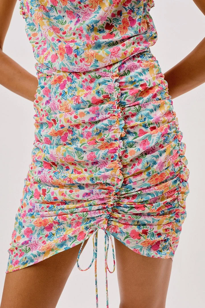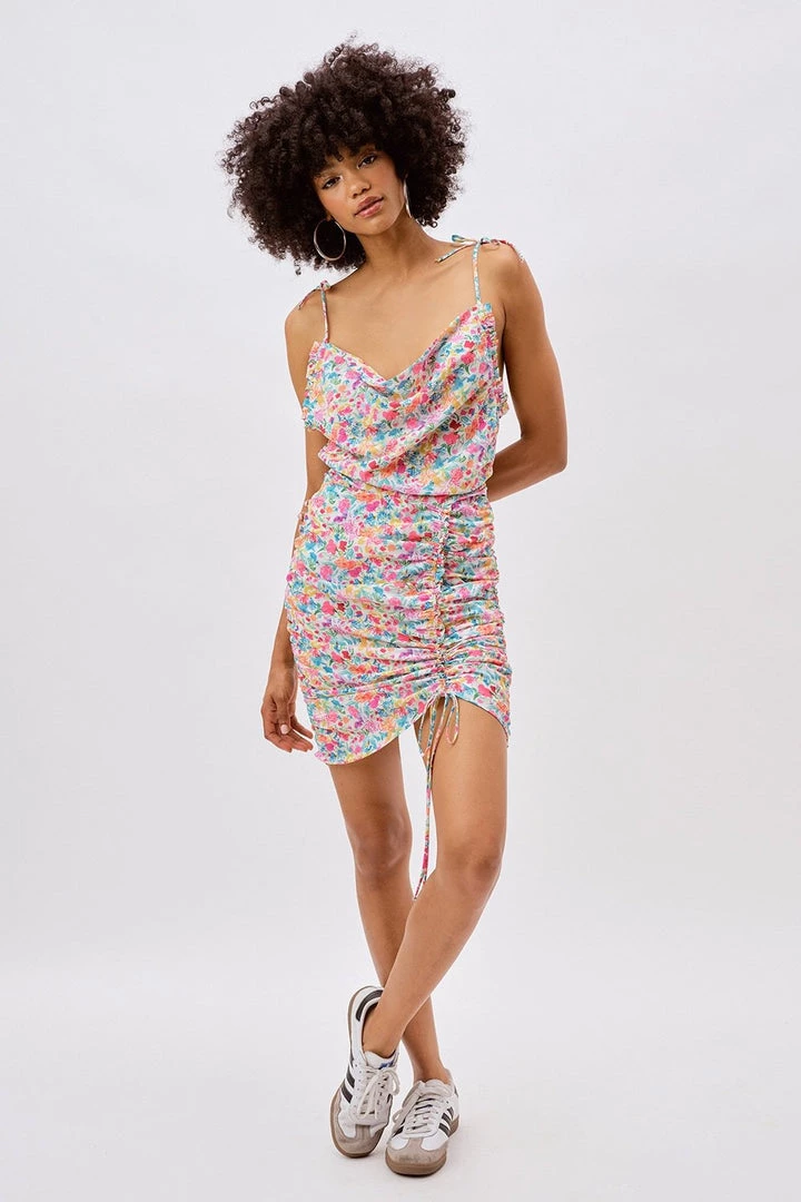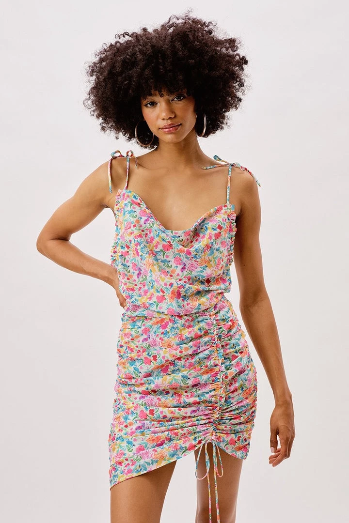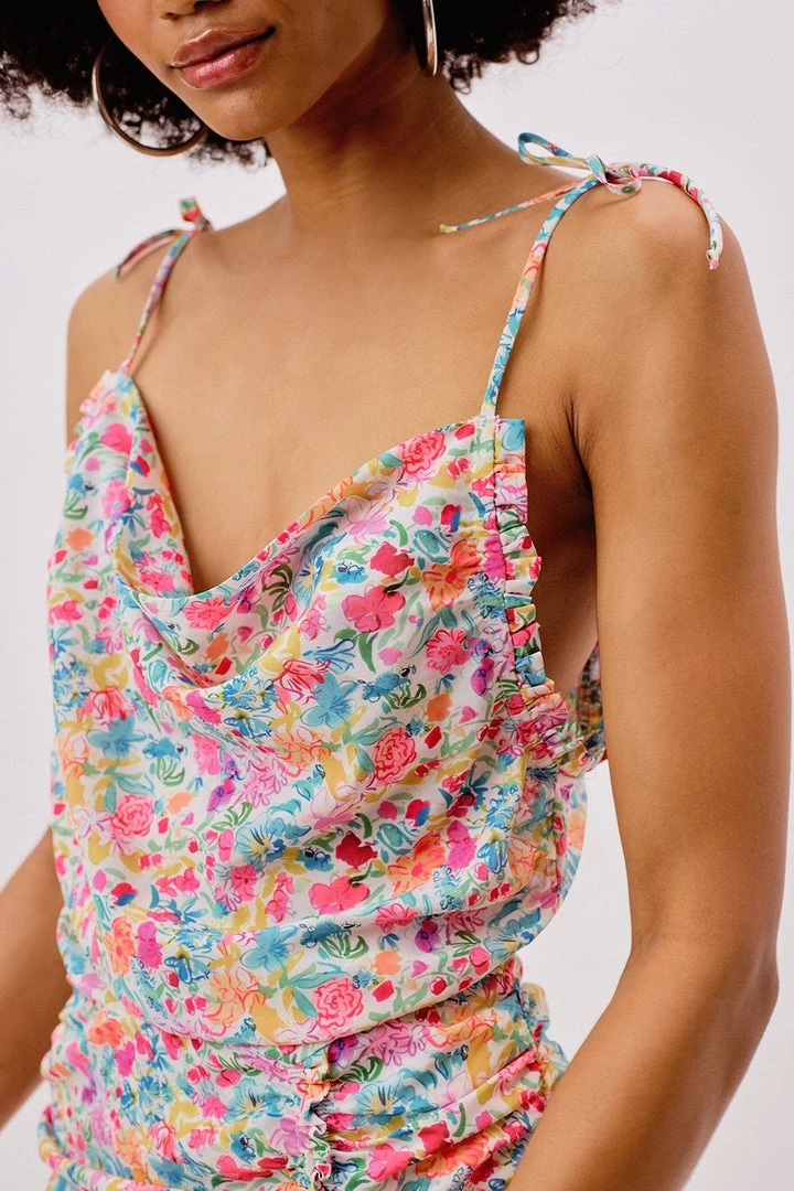 Garden print mini dress featuring a sophisticated cowl neckline and playful ruffle detailing at armholes. Delicate tie detailing throughout.