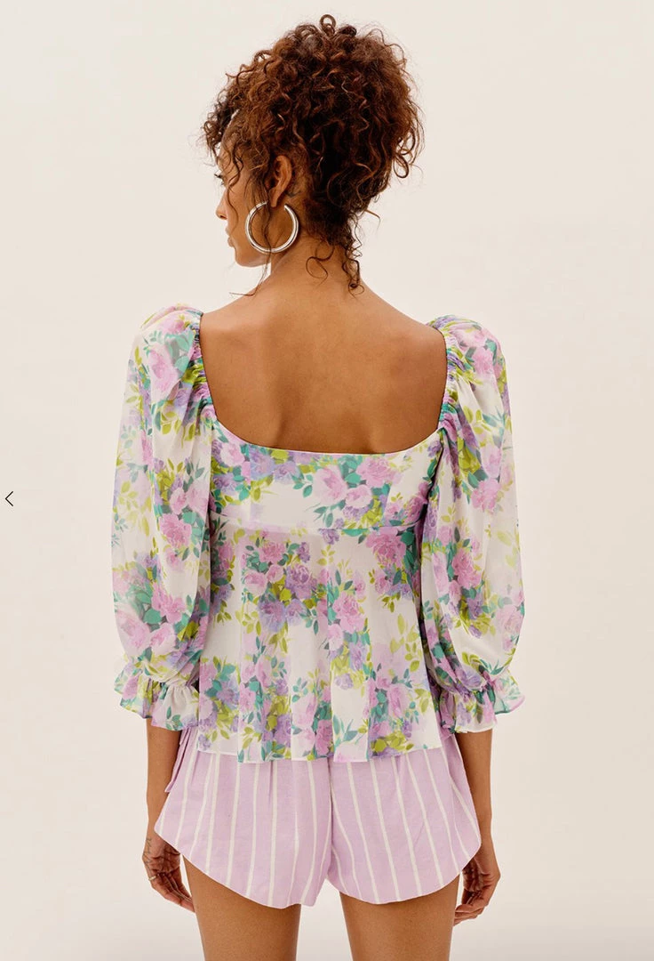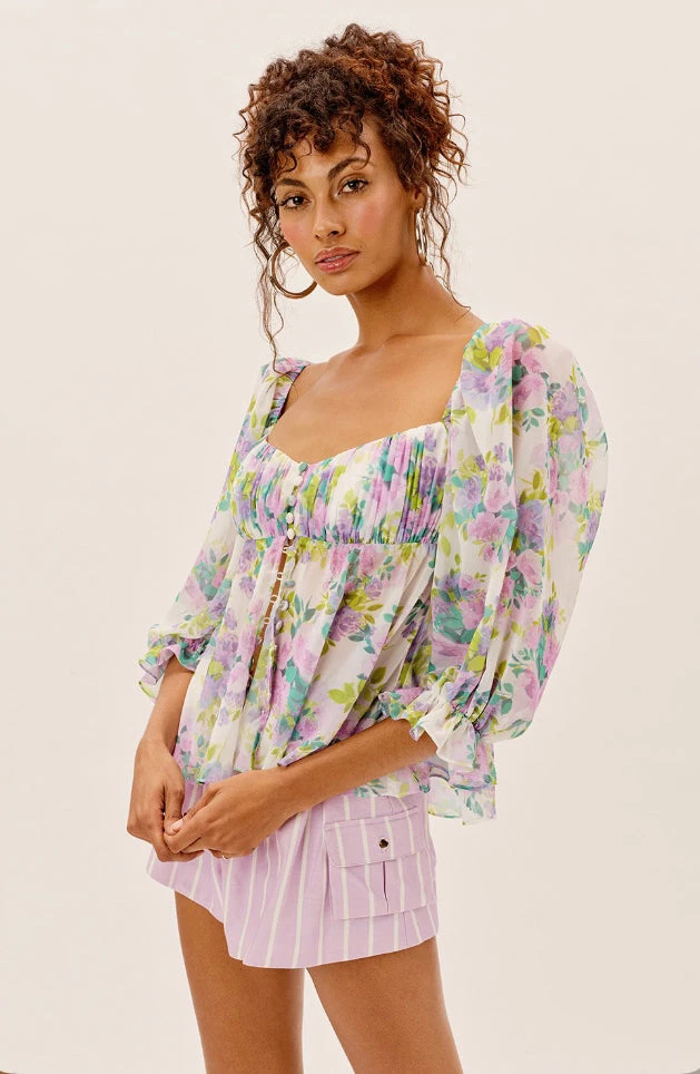 Dreamy floral bouquet print blouse featuring a feminine shirred bust, pretty puff sleeves with removable shoulder pads and tonal front buttons.