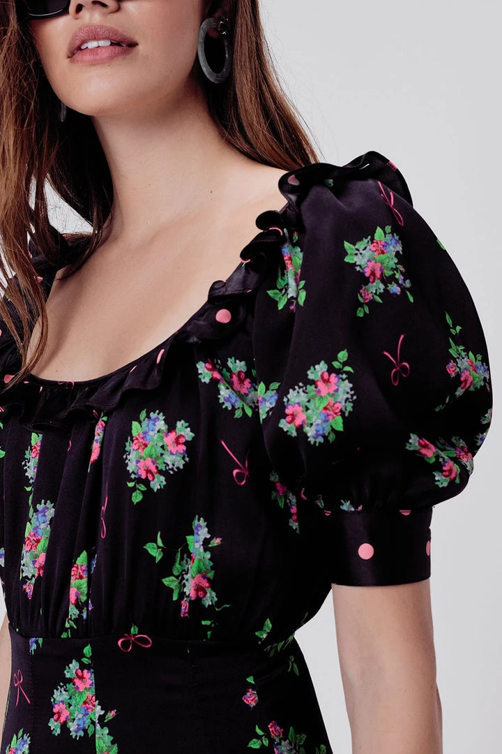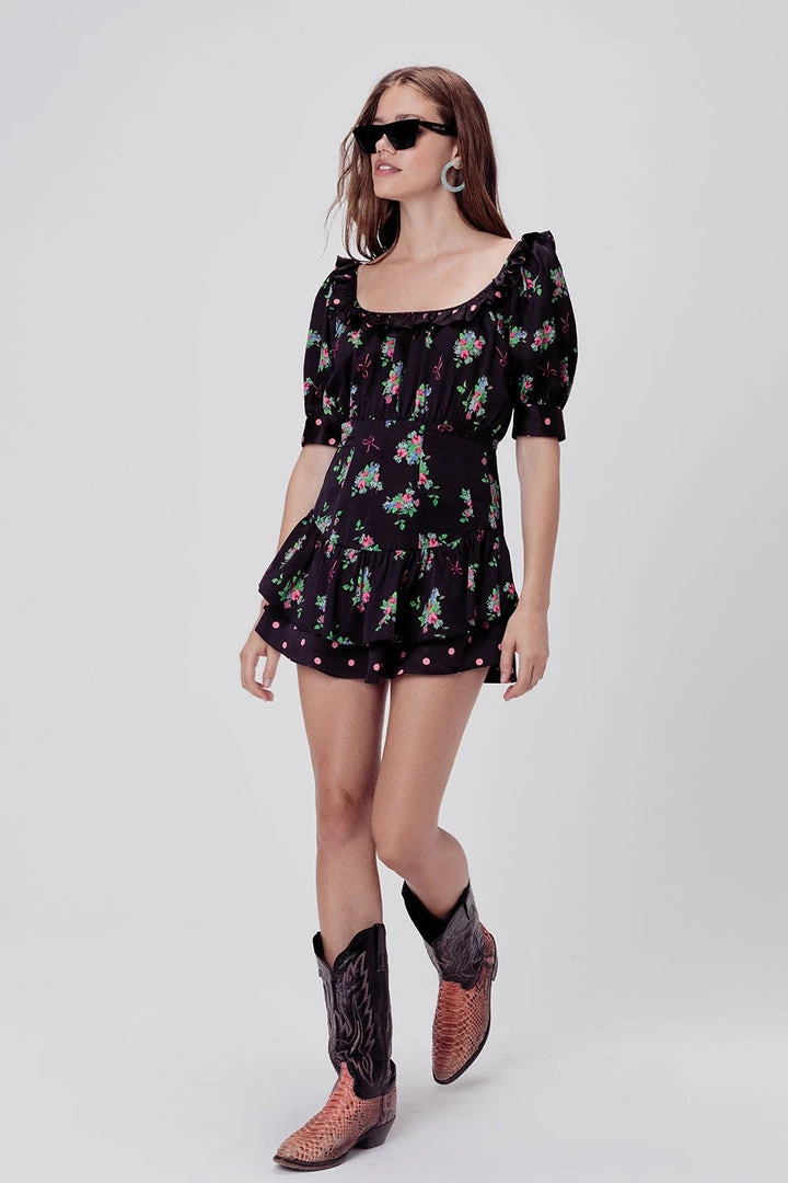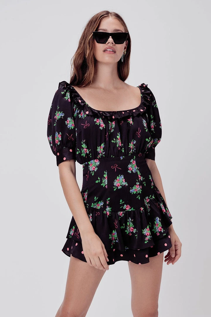 The best of everything: polka dots, bows and florals play up this ruffle mini dress, featuring a blouson bodice, scoop square neckline, fitted skirt yoke and keyhole at the back.