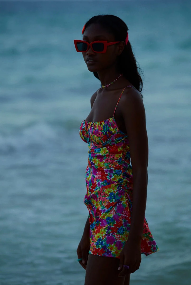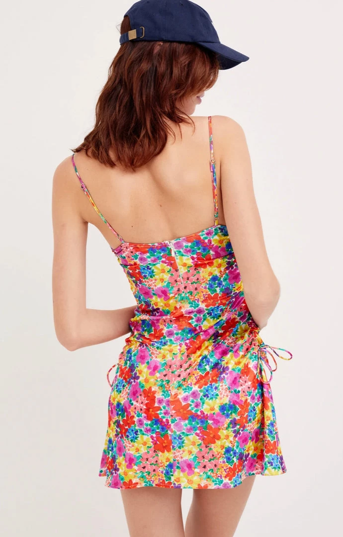 Fabric is a minimal stretch woven with a silky sheen and floral pattern throughout. Lining is a woven recycled polyester with minimum stretch.