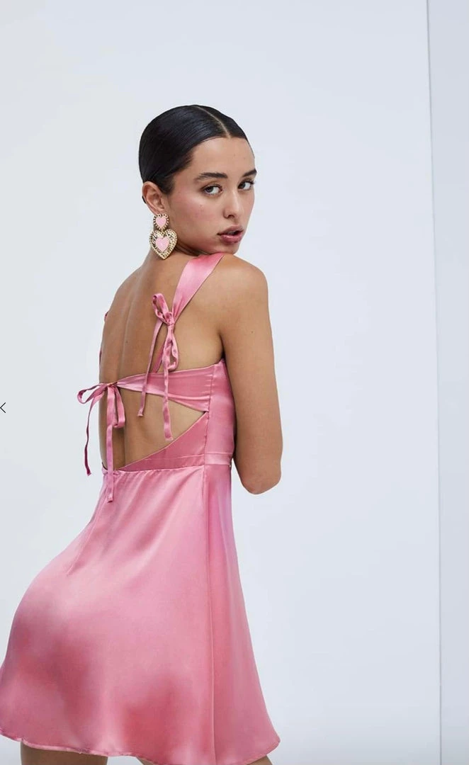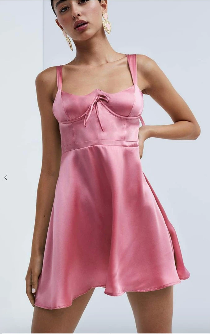 Sleek silky satin mini dress with a romantic curved neckline and underwire bust. Wide-set straps delicately tie at back. Invisible zipper, partially lined.