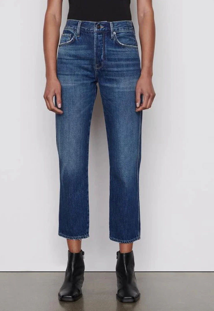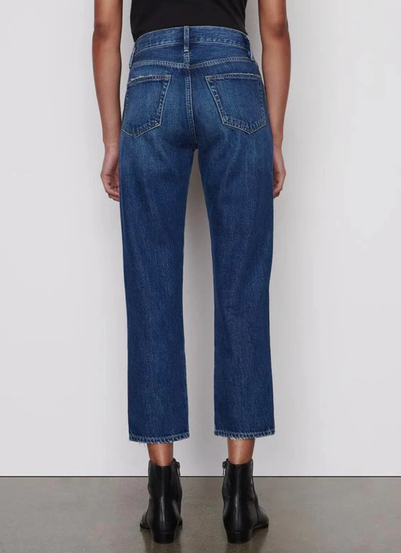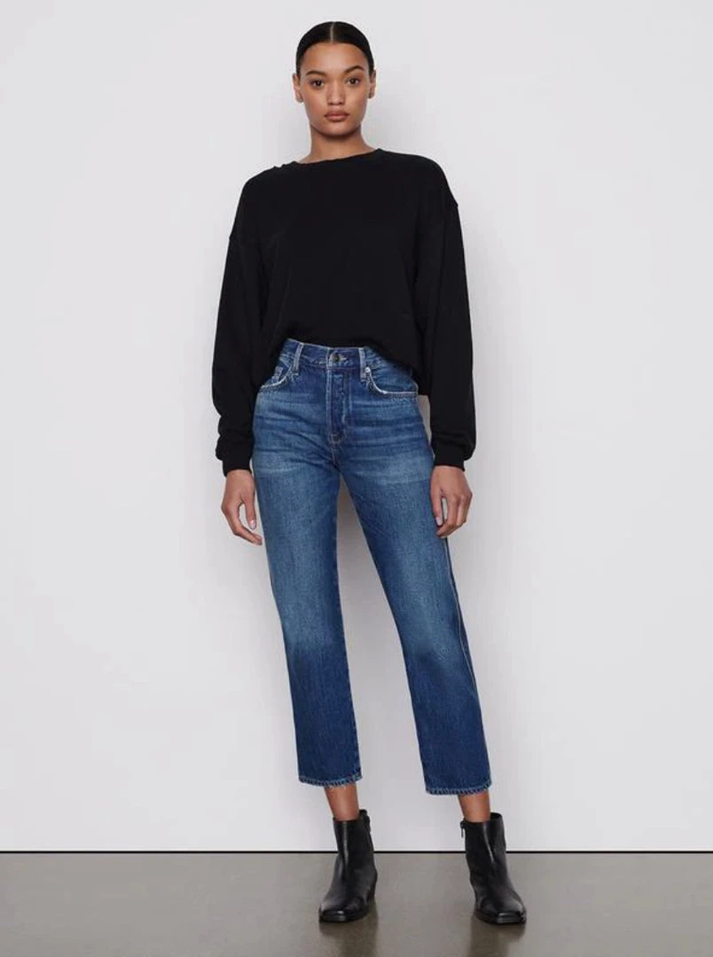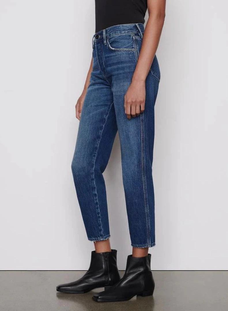 A cult-favorite for vintage-inspired style, this slim straight-leg jean features a high-rise waist that cinches in for a curve-enhancing fit. Cut from 100% cotton—15% of which is re-used—with tattered detailing for an undone feel, this pair epitomizes early fall style with a ribbed top or leather shirt on top.