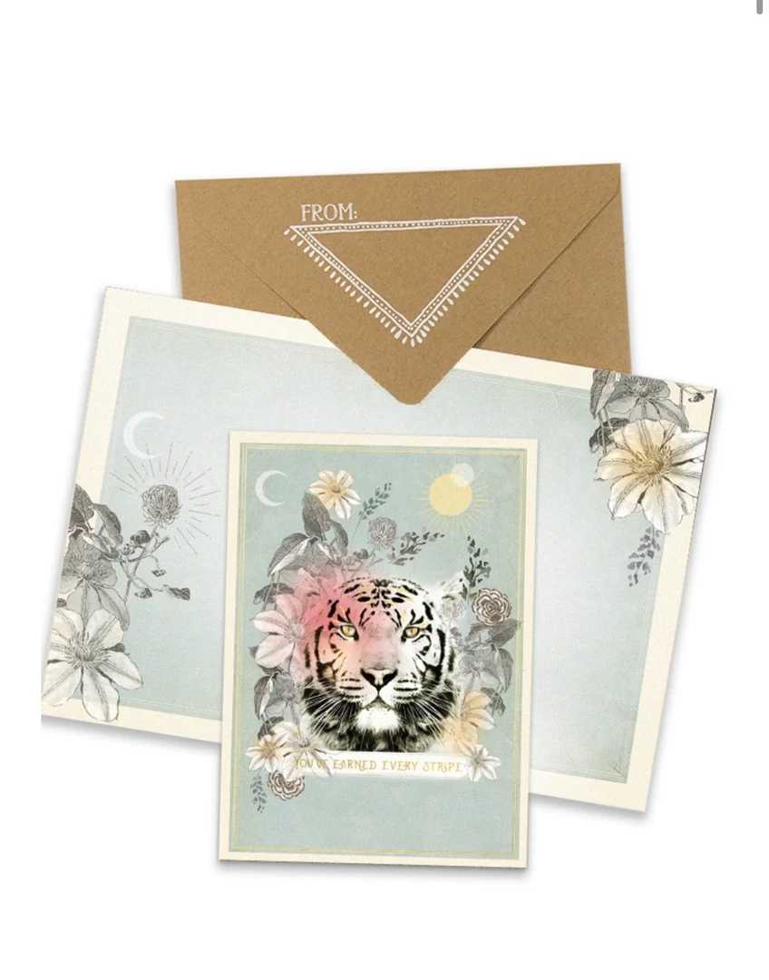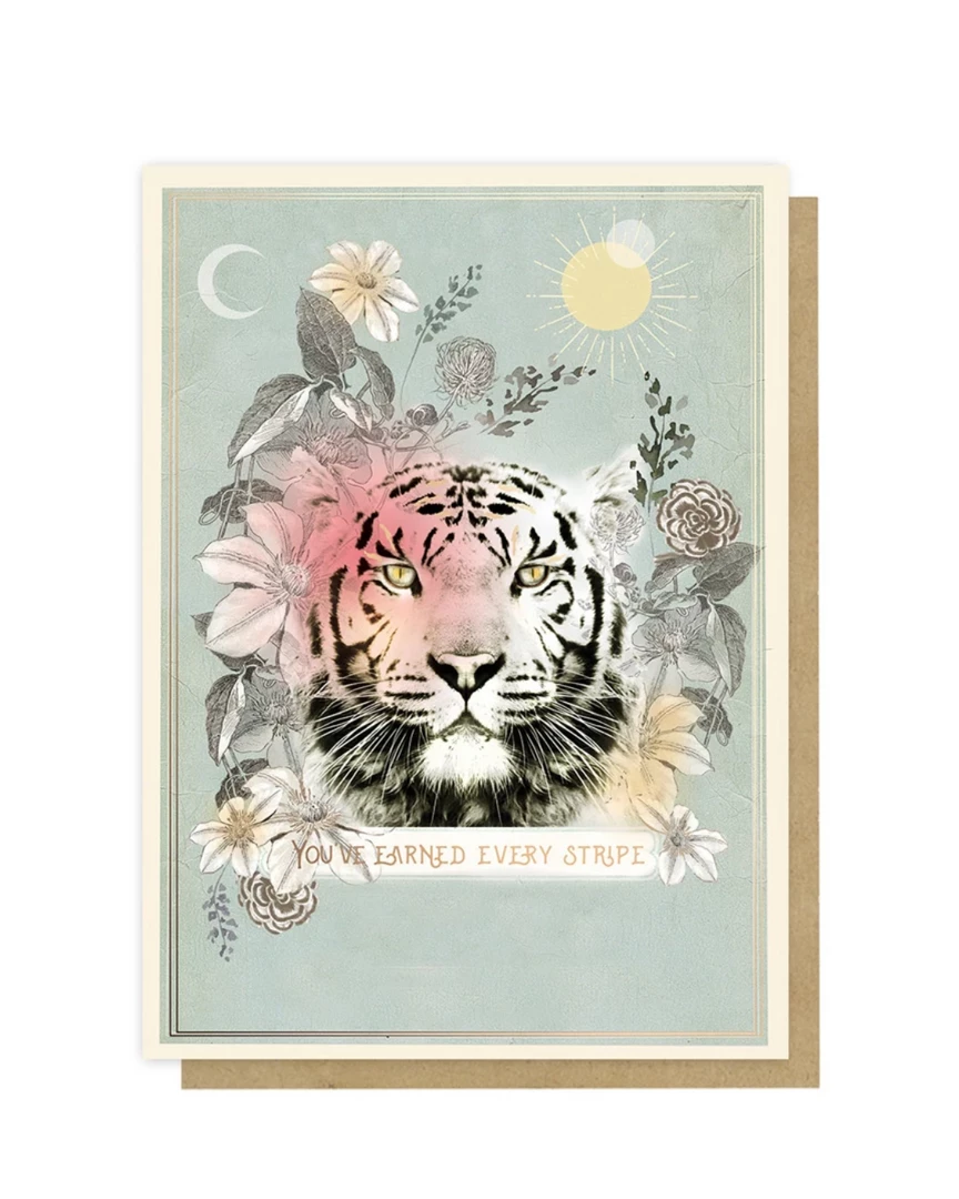 PAPAYAâs classic, green Stripes Greeting Card is a fan favorite illustrated with original artwork of a powerful tiger, delicate florals and muted sun, moon, and Earth elements; it is sure to brighten your day.  Perfect for all occasions such as wedding, anniversary, business, bridal, birthday, motherâs day and graduation.