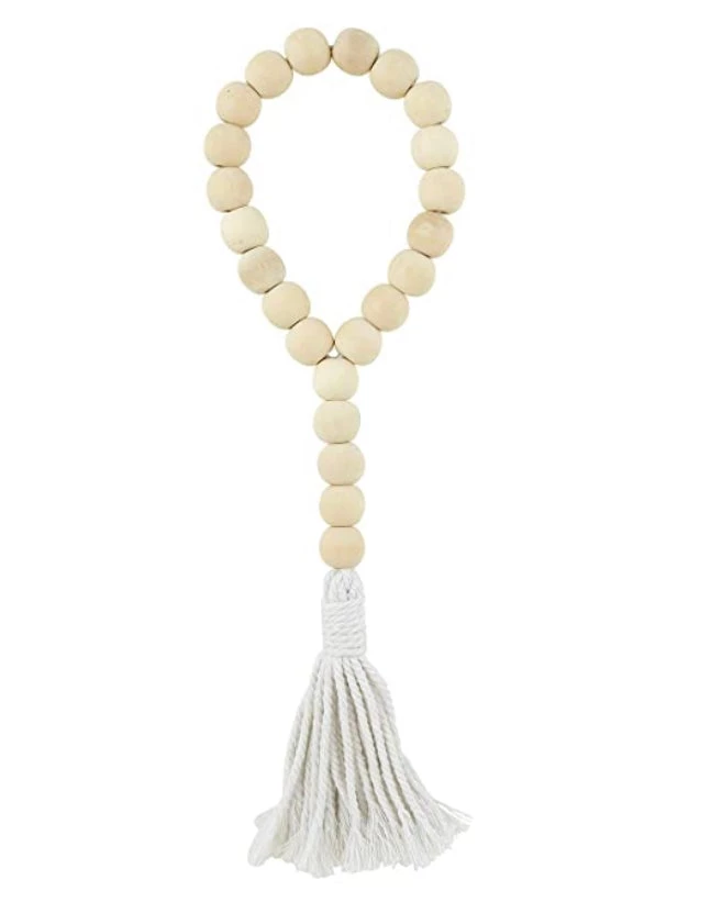 - Looped wooden garland with soft cotton tassels measures 11.5″ Long with a 5.25″ Loop; total length approximately 16.75″