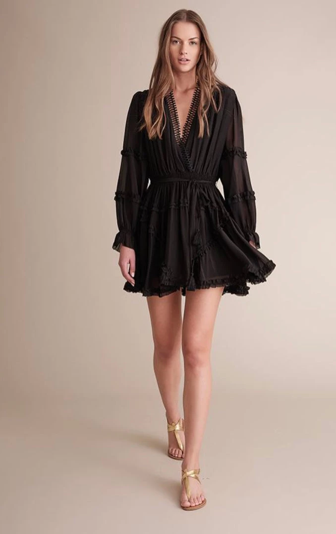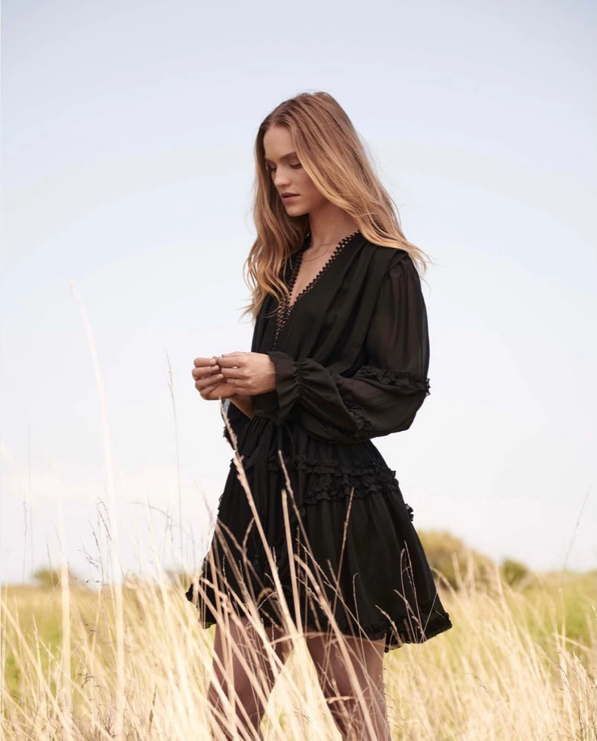 The “Lynne” dress is whimsical, fun and feminine. It’s cut from airy silk with a plunging v-neckline. Smocked elastic waist, tie front belt with tassels and petite ruffle details at skirt and at the sleeves.
