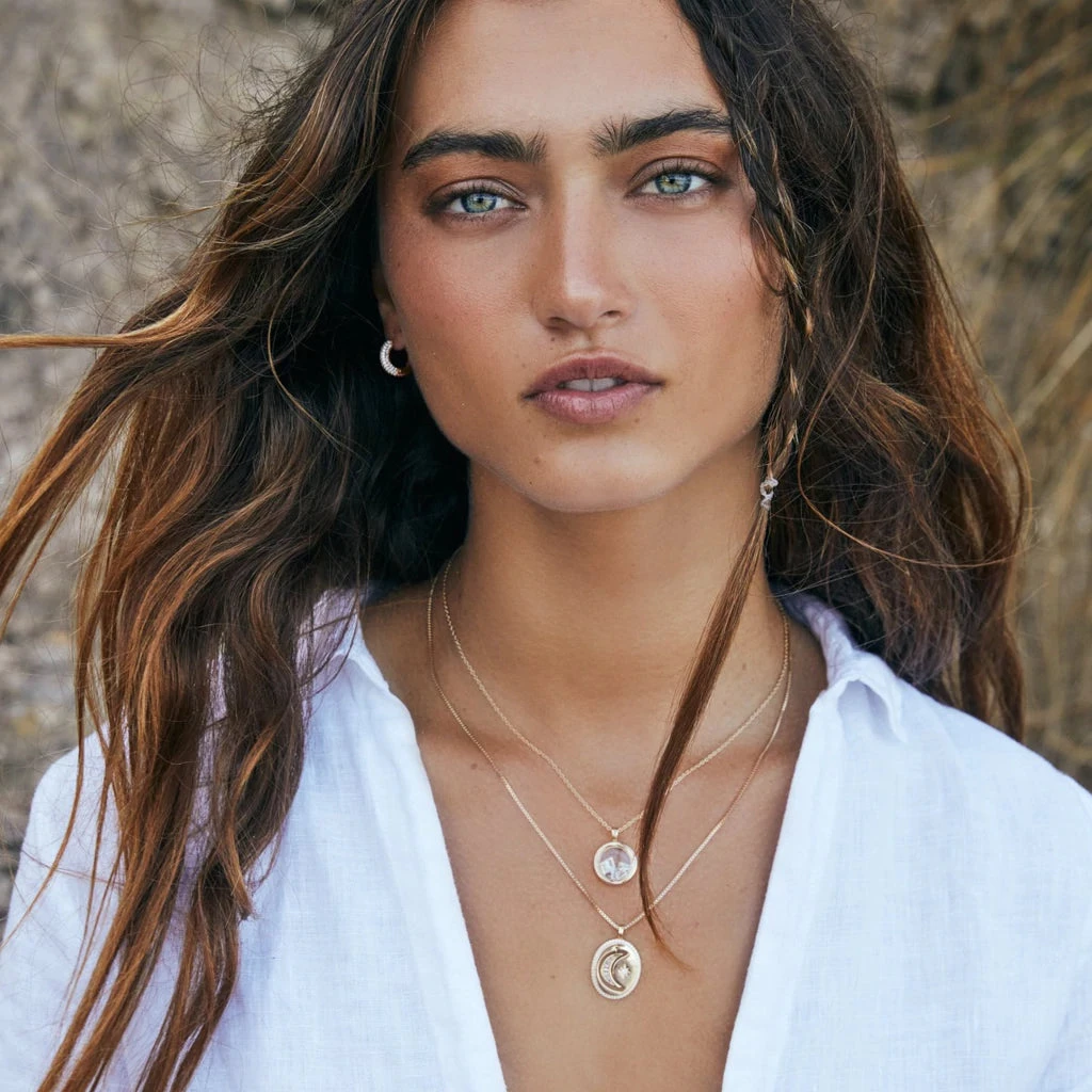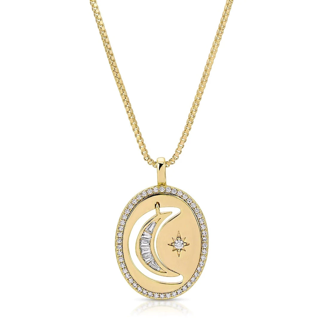 Celestial lovers rejoice! This is the necklace for you. The baguette crescent floats freely while the north star twinkles.
