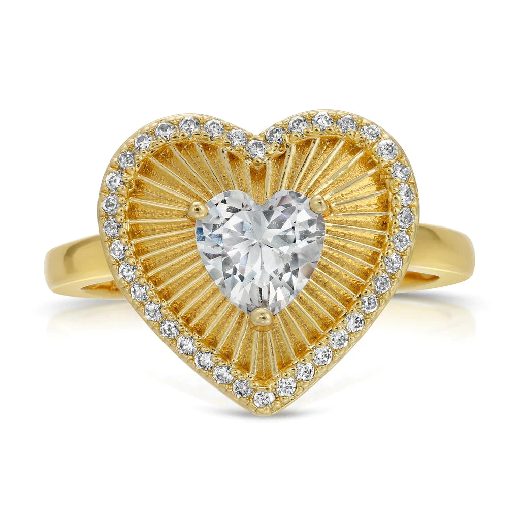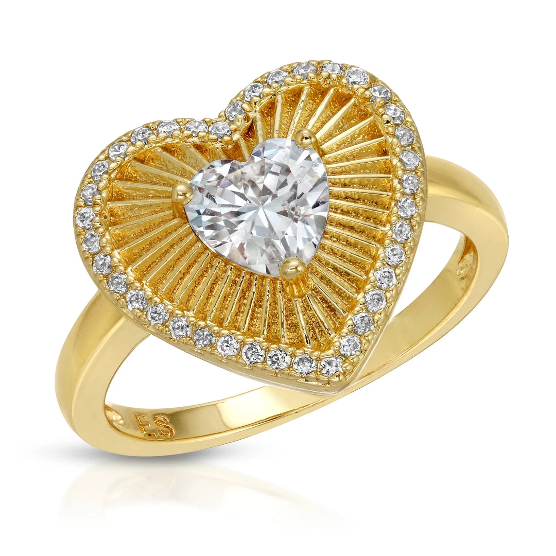 Love at first sight! A sparkling heart center stone surrounded by rays of texture.  Micro pave border.