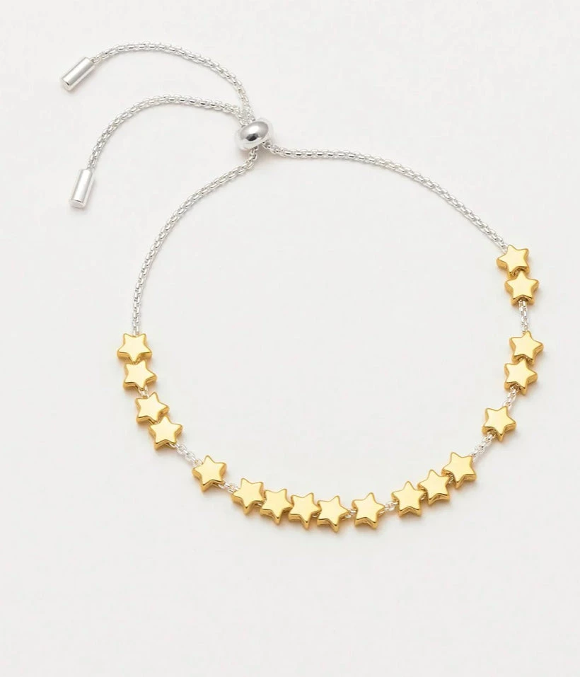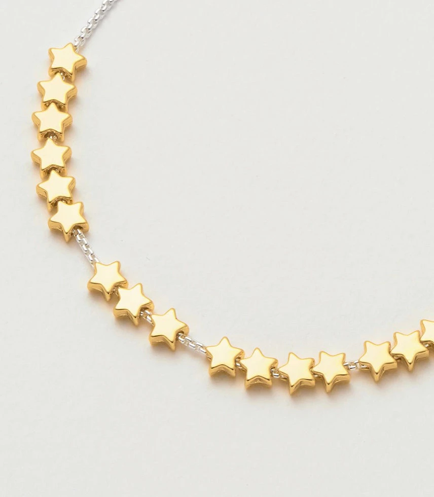 Our classic ‘Stars So Bright’ bracelet has had a style update! Keep starry eyed with this beautiful friendship bracelet made of gold plated stars, threaded onto a silver chain.