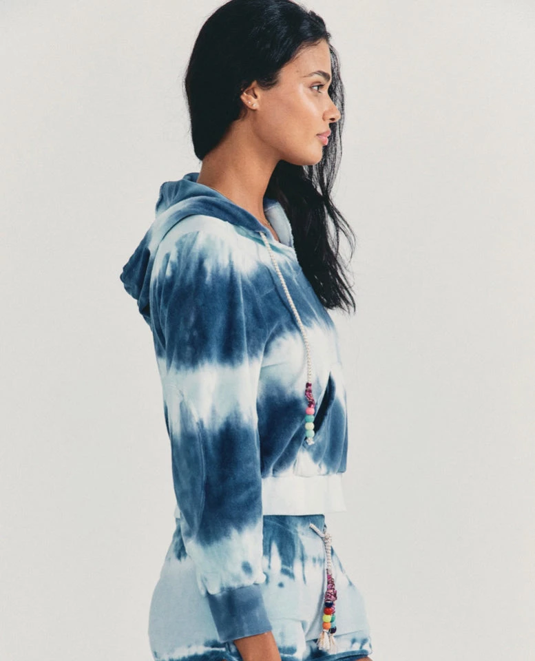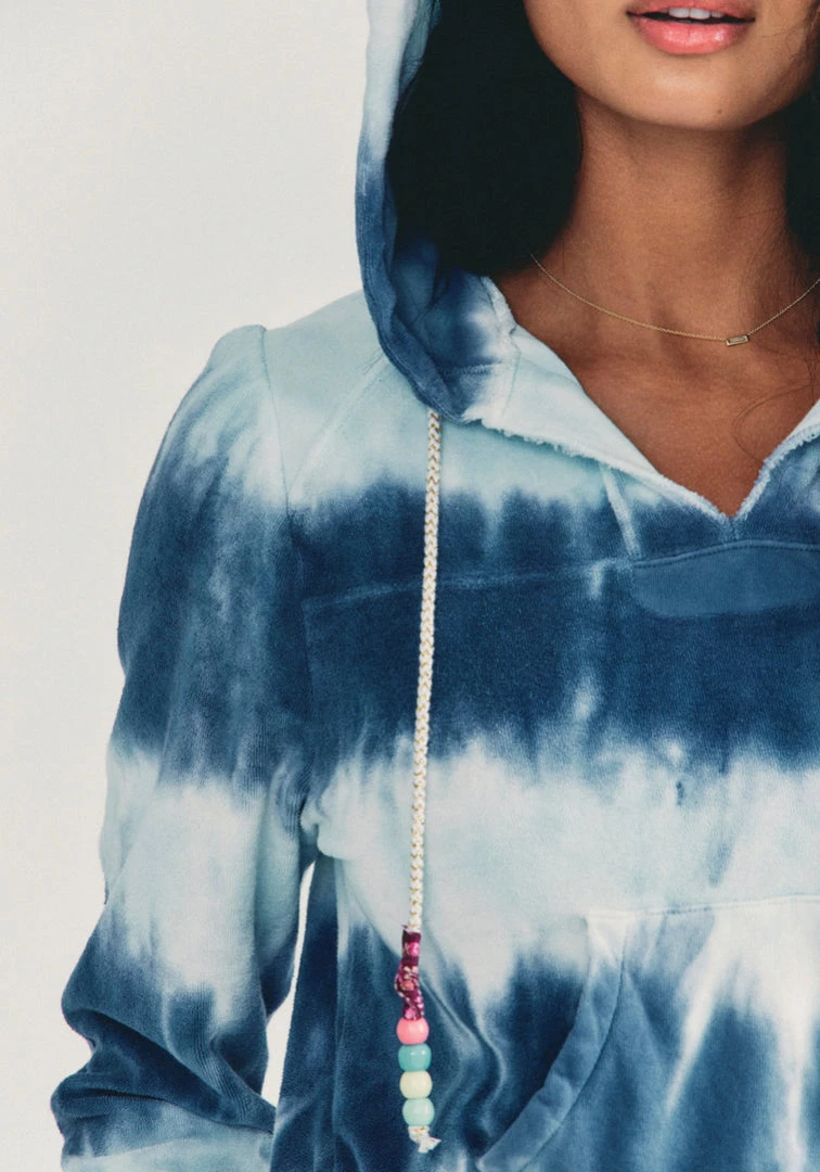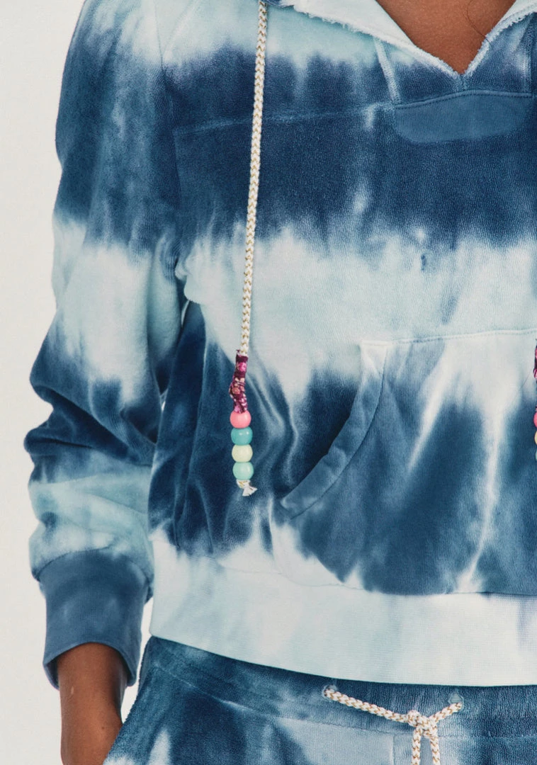 Our Kirby Hoodie is a perfect layering piece in hand-dyed French terry cotton. This cozy sweatshirt has a v-neck with raw edges, framed by functional rope drawcords wrapped in a contrast floral print with beads. Long puffed sleeves feature elbow patch seaming and a tall cuff at opening. A kangaroo pocket at front is adorned with a blanket-stitched heart patch.