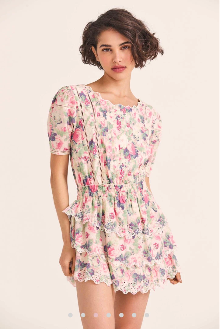 Our Mavis Dress is an instant LoveShackFancy classic in 100% cotton with pintucking, contrast stitching and panels of inset embroidery. This front-to-back minidress features a shaped scoop neck, short sleeves, a shirred elastic waistband and three eyelet-embroidered, asymmetrical skirt tiers with scalloped edges.