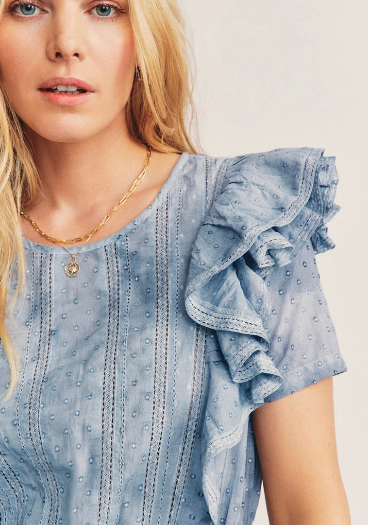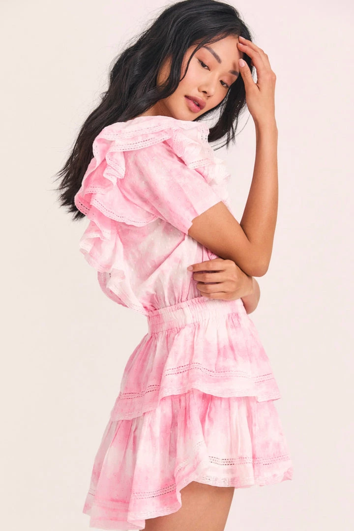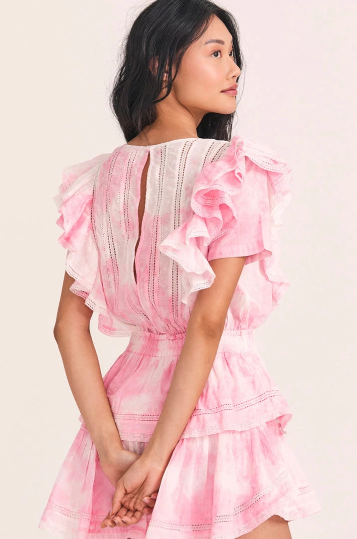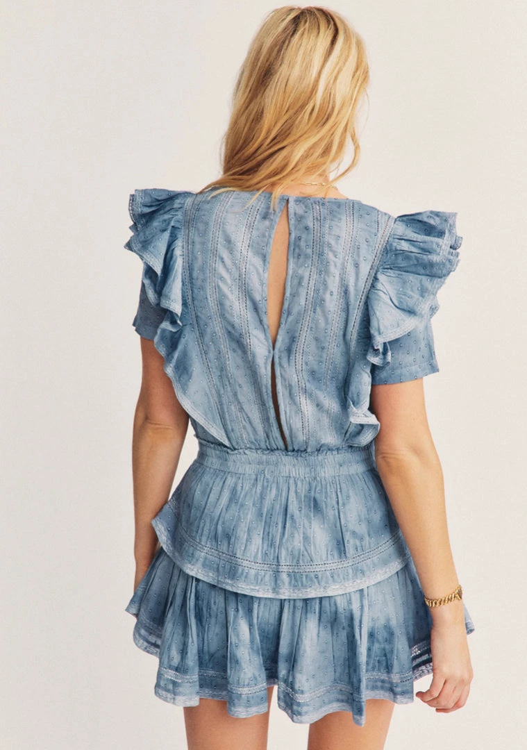 Our Natasha dress features double ruffled flutter sleeves that cascade down the front and back of the body to highlight the elasticated waist. Intricate inset lace trims add an air of femininity and ease. Styles are Hand Dyed.