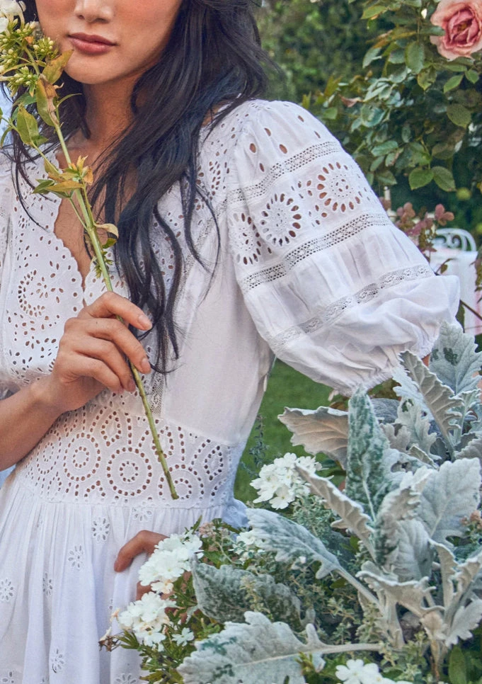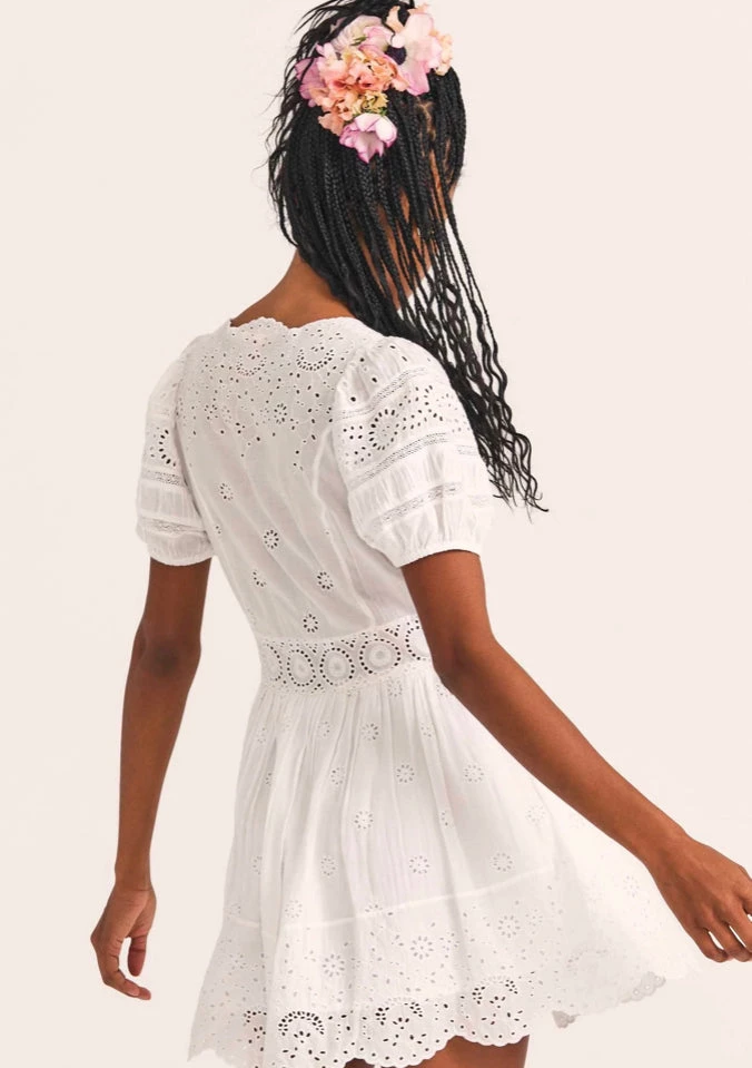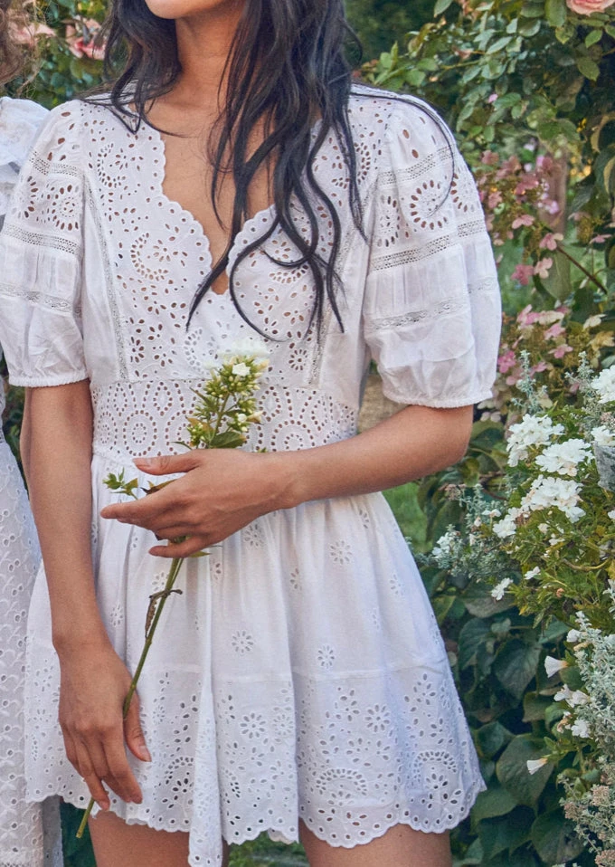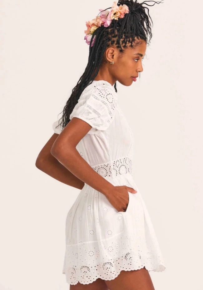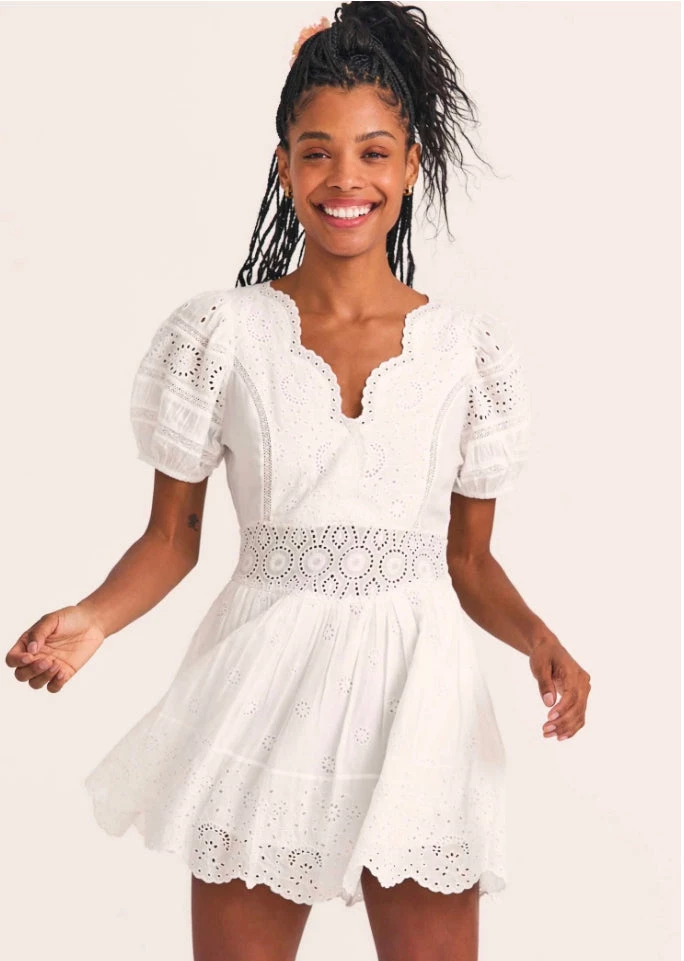 Meet our Valente Dress, a new silky favorite with a mix of eyelet embroidery and inset lace. This frock features puffed sleeves with elastic at opening, a shaped scallop-edged neckline that plunges to an overlap at front and an ornate waistband. The full sweep miniskirt is shirred with a scalloped bottom hem.