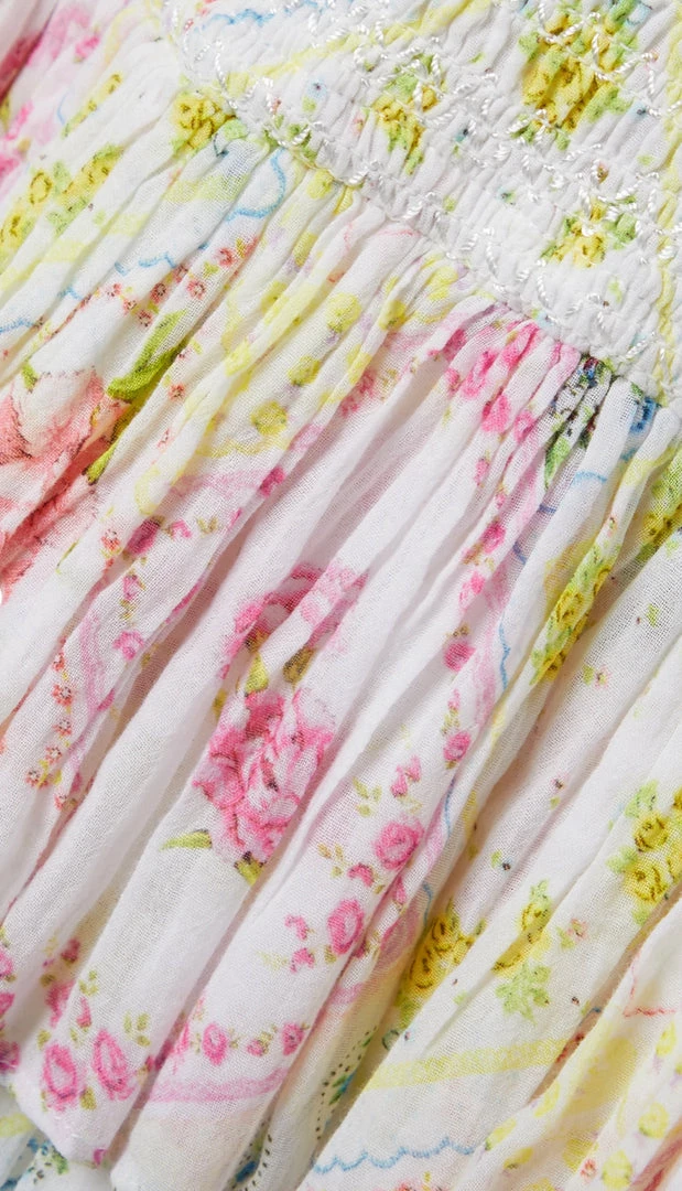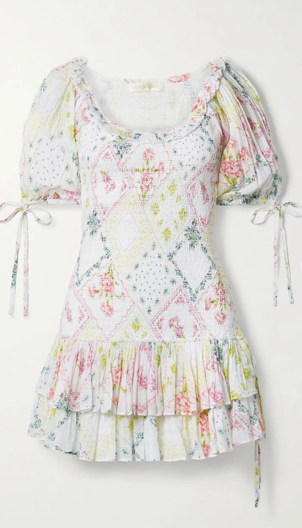 Rebecca Hessel Cohen often incorporates her love of vintage into LoveShackFancy’s collections, most notably in the patterns and silhouettes. This ‘Violet’ dress is made from airy cotton-voile decorated with pretty blooms in a geometric design. It’s shirred for a flexible fit and has puffy sleeves with adjustable drawstring ties.