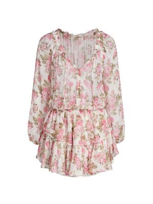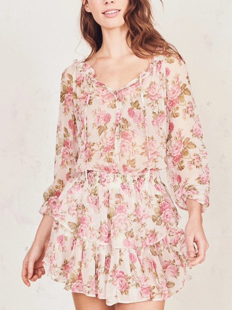 Our iconic Popover Dress is now reimagined in 100% silk with this season’s signature Victorian rose print. The open neckline framed by dangling ties slips on or off the shoulder at will. Raw-edged, shirred, encased elastic detailing at the neck is mirrored at the waist above a miniskirt with two flounces. Shown here in Blushing Rose.
