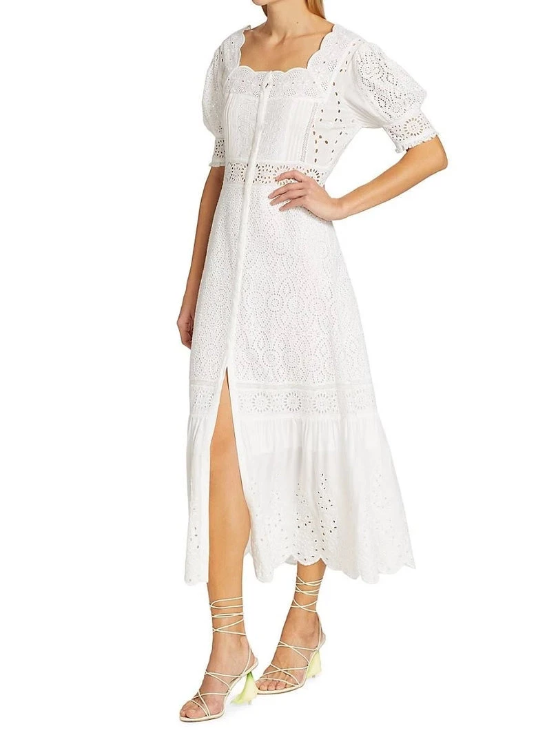 The new Helena Dress is a work of art in our soft modal with an elaborate mix of all-over contrast eyelet embroidery. This ankle-length frock features a subtly scalloped neckline, a hidden button placket down center front, puffed short sleeves with ruffle trim, elastic at center back waistband and a scalloped bottom hem.