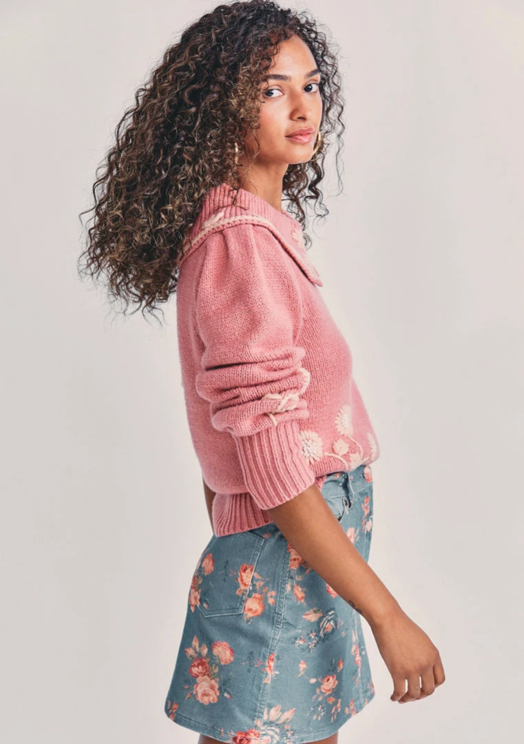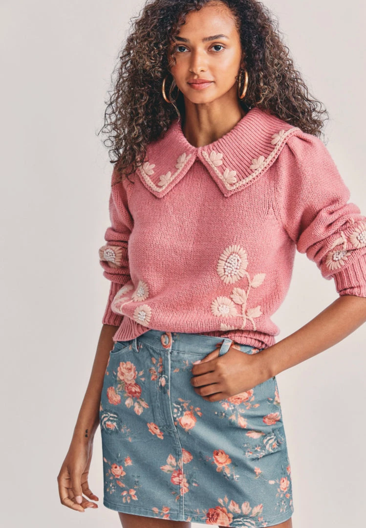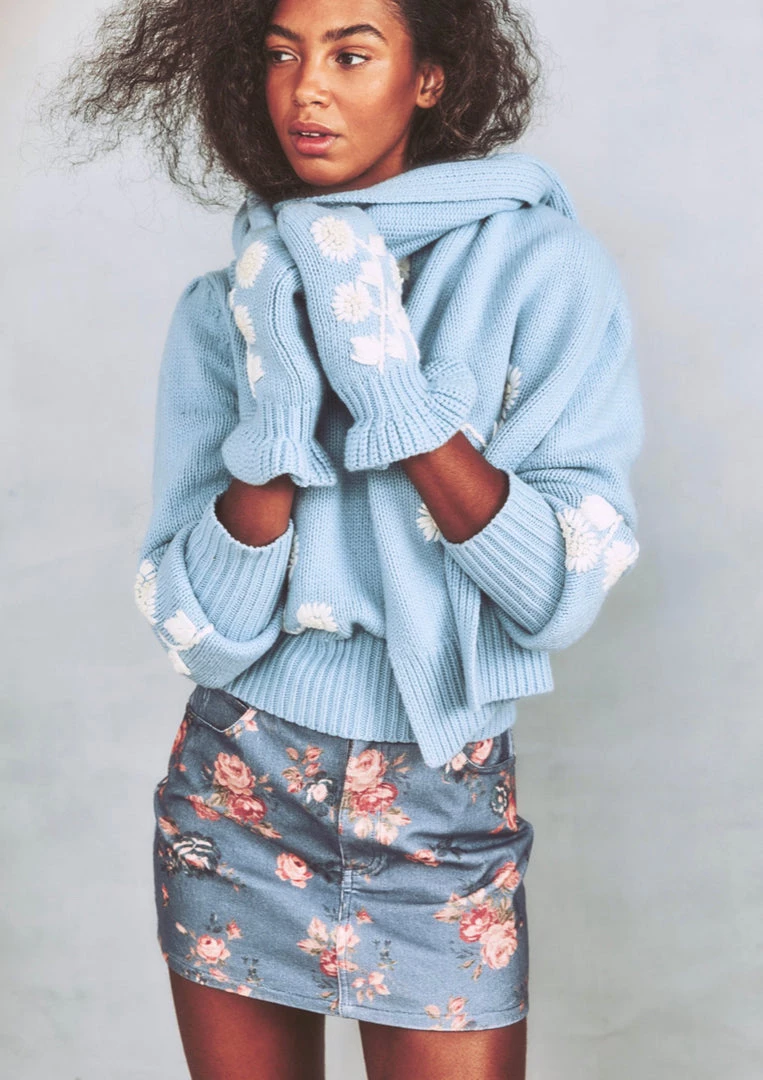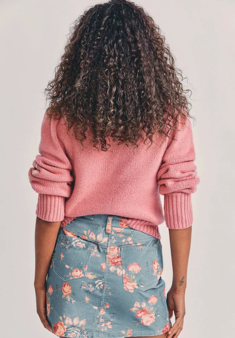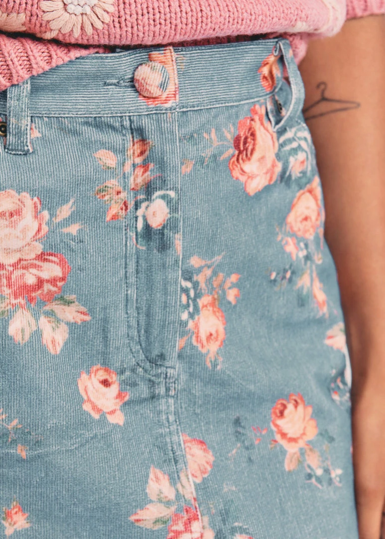 Our Hollywood Skirt is a classic, with tights or bare legs, in corduroy with a vintage-inspired carnation print. This slim denim-style skirt has a true zipper-fly, belt loops, rounded pockets with a coin pocket at wearer’s right and patch pockets at back. Pair it with our Janie Cropped Cardigan.