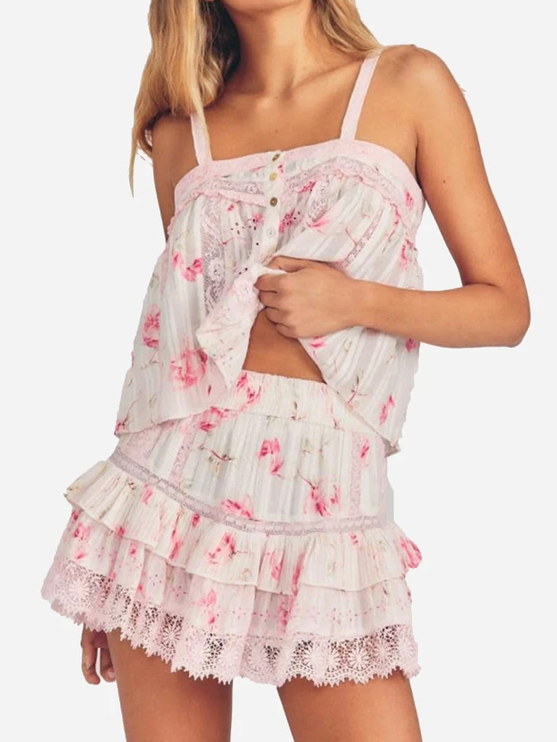 The Loveshackfancy Maitri Tank is all about the details in 100% cotton. This day-to-night top features dobby stripe fabric, center-front placket and custom inset laces and embroidery throughout. Pair it with the Tanisha mini skirt.