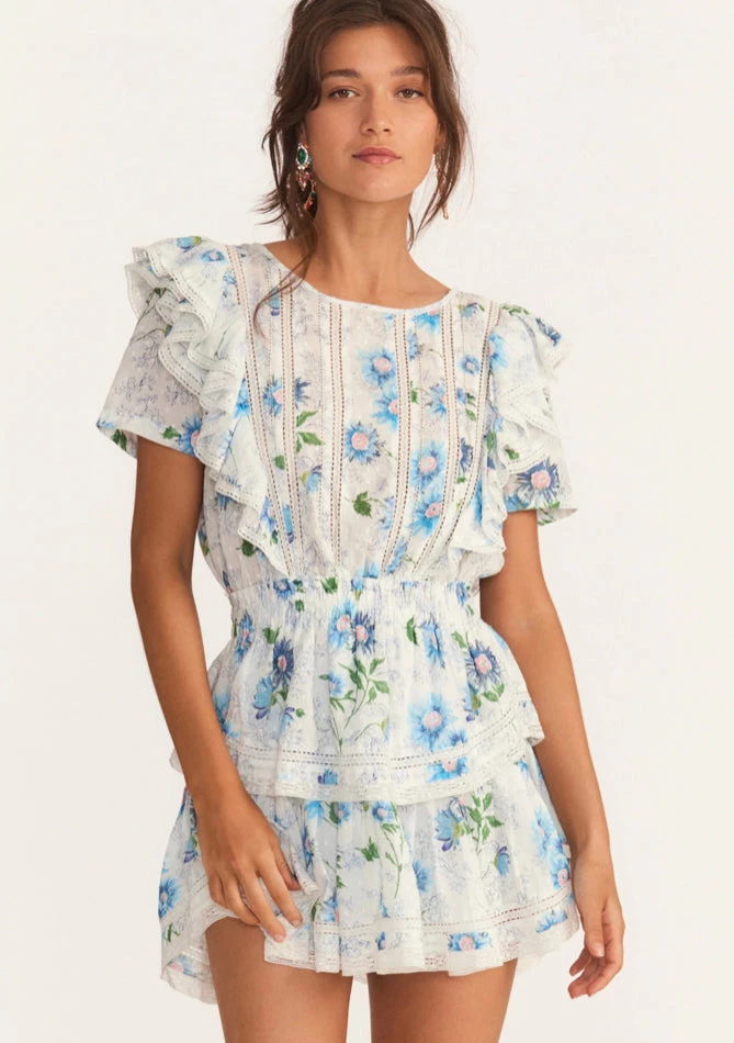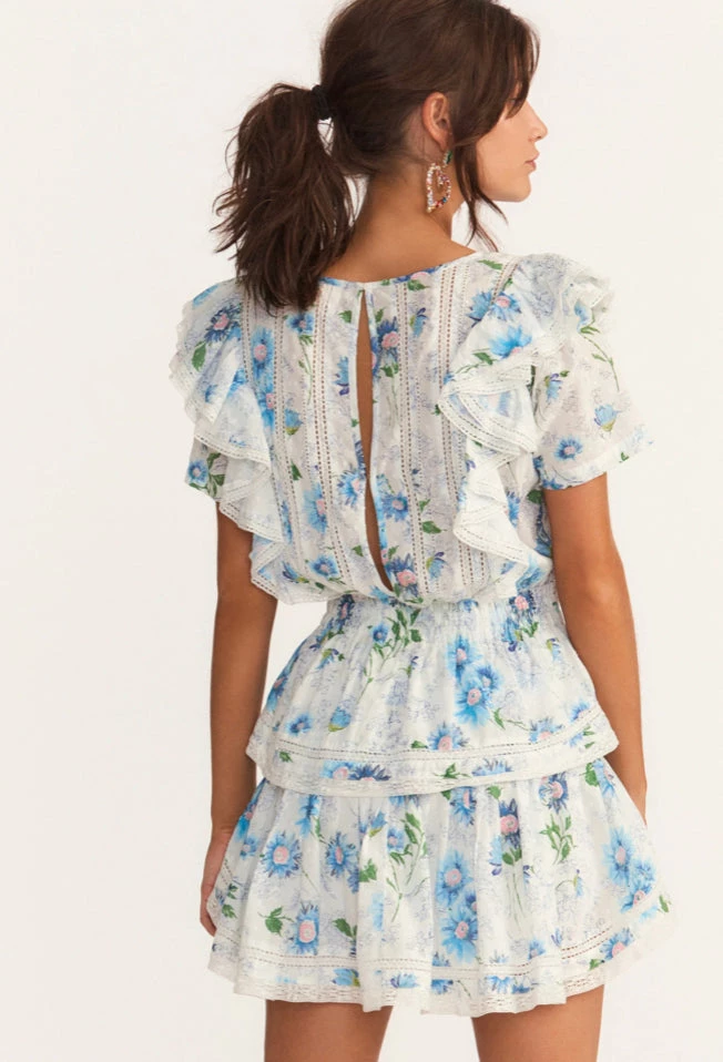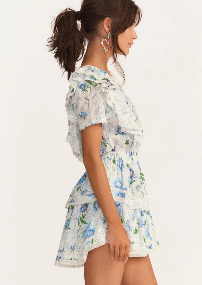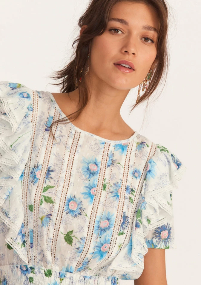 The signature Natasha Dress is back for the summer in a dreamy, new floral print. This easy frock features double ruffled flutter sleeves, which cascade down the front and back of the body to highlight the elasticated waist. Intricate custom lace panels are inset and trim the skirt’s flounces. Shown here in Blueberry Cloud.