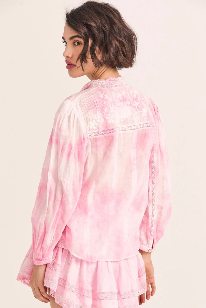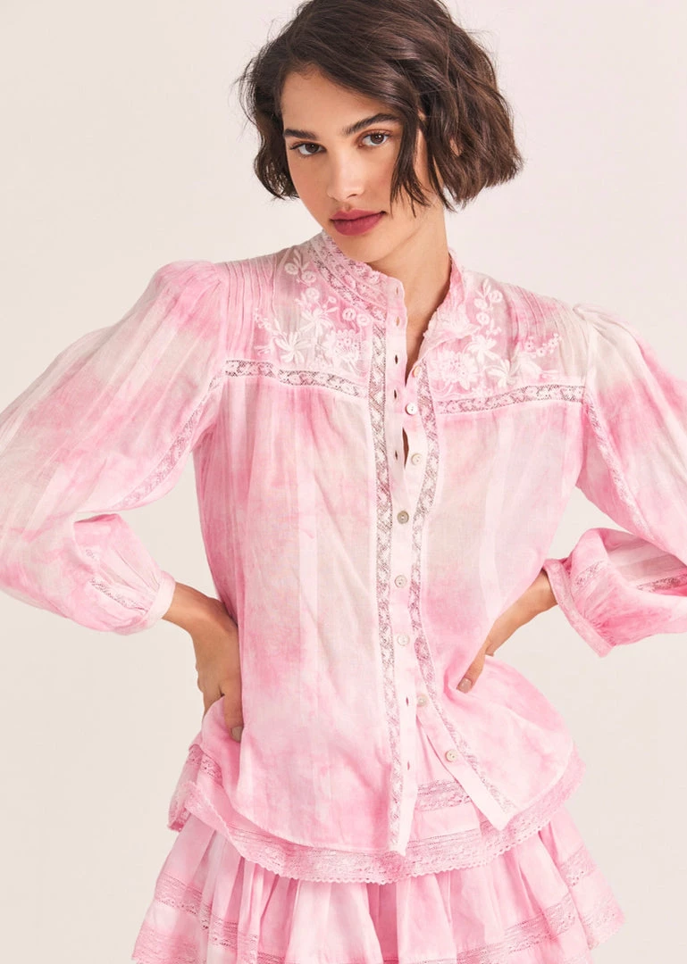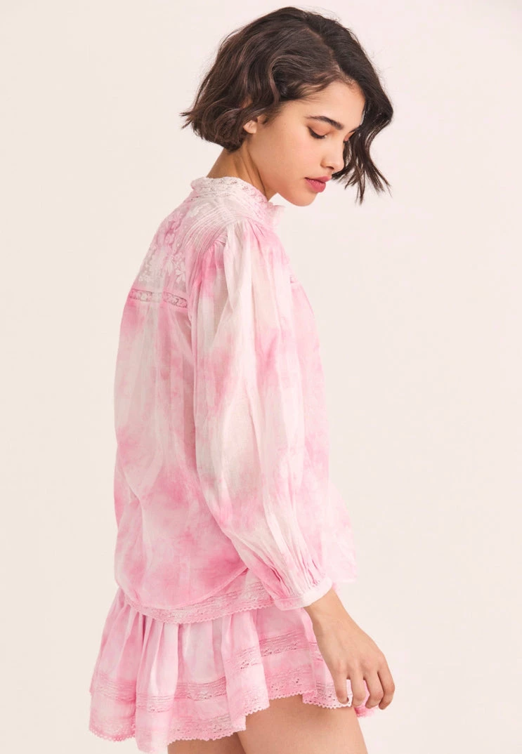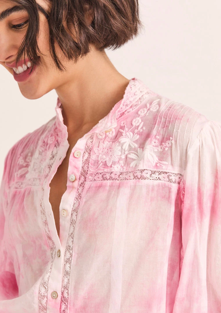 Our Ronda Top returns in naturally hand-dyed cotton with inset floral lace. Our take on the collared shirt features a lofty wildflower embroidered yoke at front and back. Relaxed blouson sleeves have pintucking at the shoulders and let down to small functional cuffs. Center buttons run the length of the front. Wear it as a pair with our Ruffle Mini Skirt.