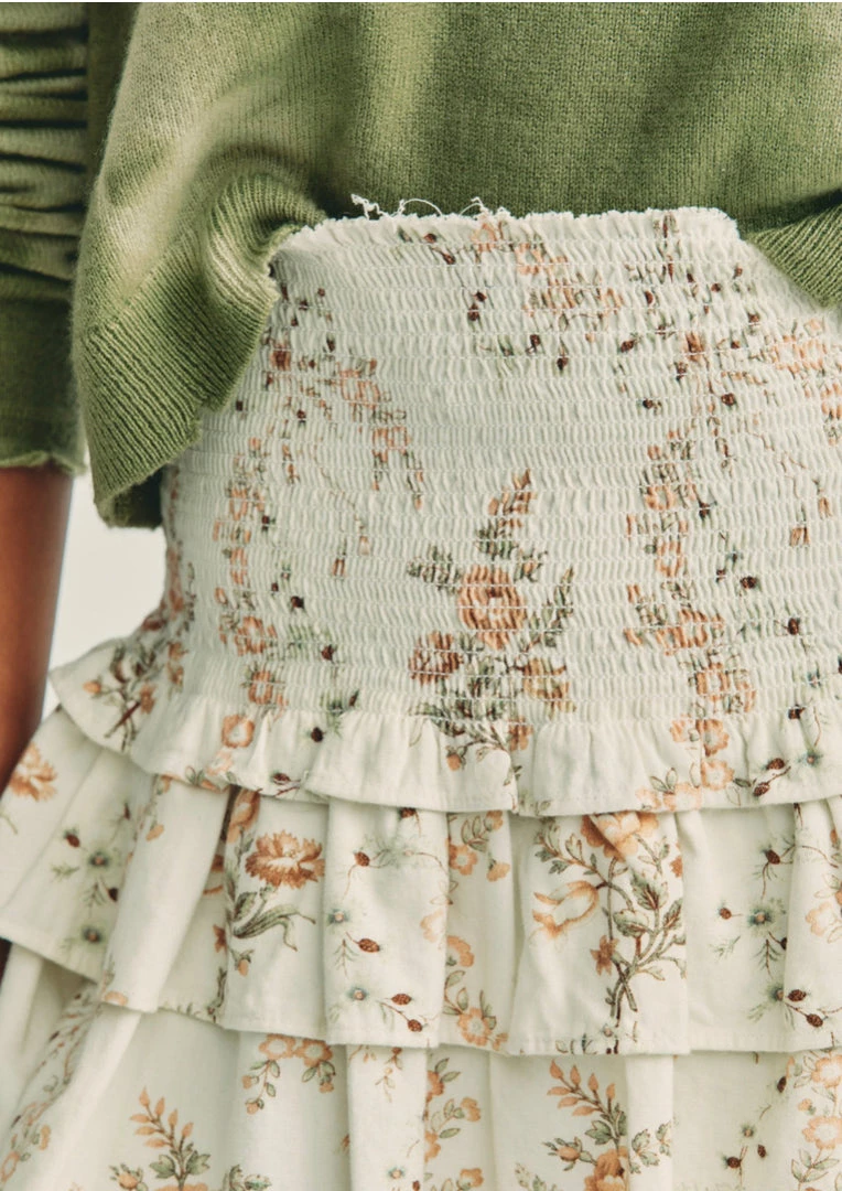 Our Sowa Skirt is an instant favorite in lightweight brushed cotton with a vintage-inspired French textile floral print. This slip-on miniskirt has a smocked top panel above scaled (small to large) tiers. The bottom hem is embroidered and scalloped.