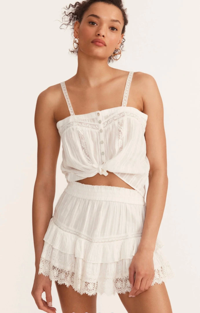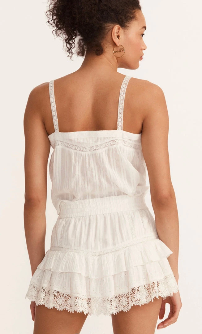 Our Tanisha Skirt makes waves in 100% cotton. A hero Victorian, this mini features an elastic waistband at the top and eyelet detailing with custom crochet lace. Finished with a cute tucking detail with slight ruffles. Wear it as a set with our Maitri Tank. Shown here IN True White.