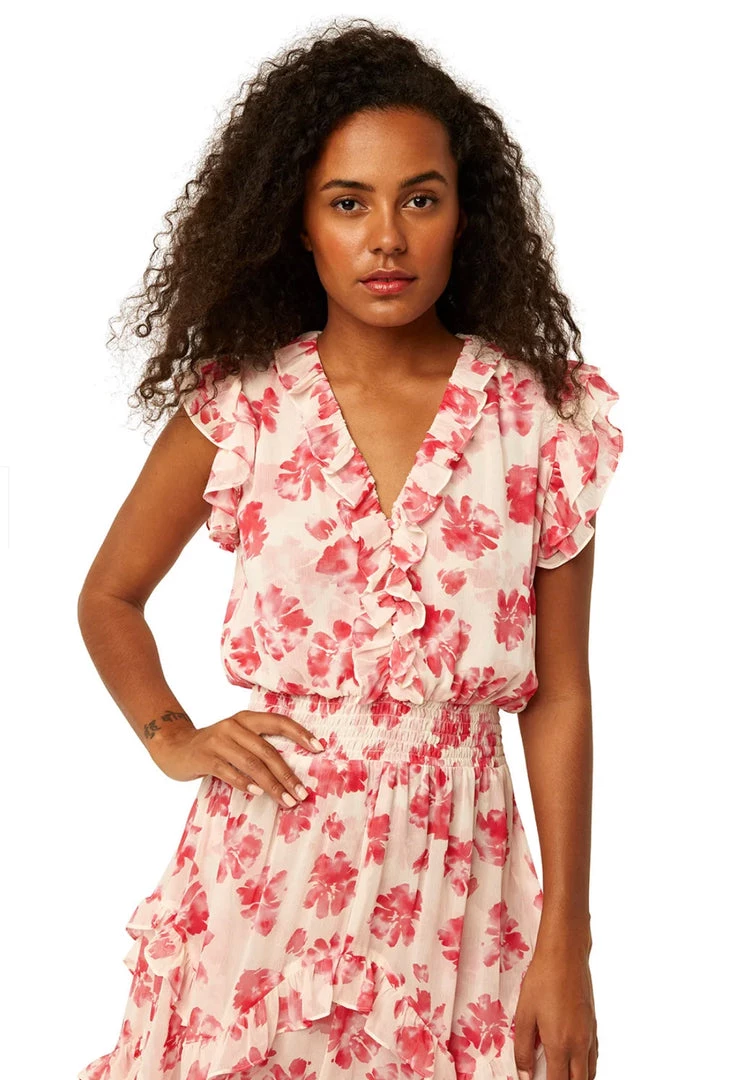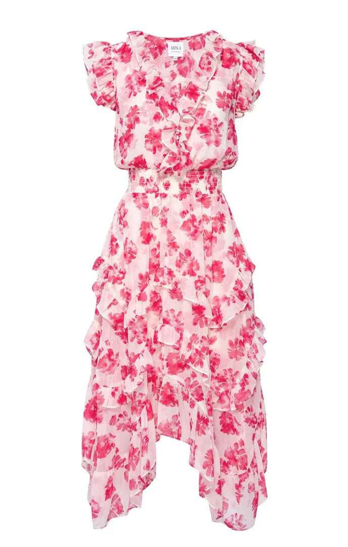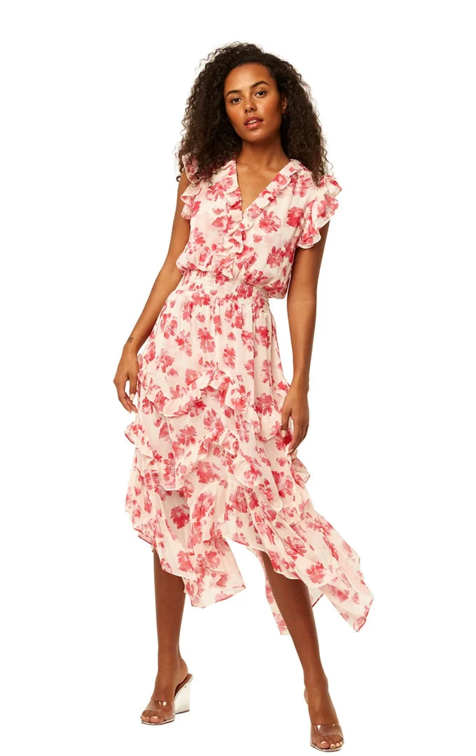 Chic and universally flattering, the best-selling Dakota is a playful yet elegant midi dress with stunning ruffles that take you from your desk to dinner any day of the week. Cut from a stunning blossom print chiffon, this many-moment dress features a button neckline with a ruffle trim that compliments the sweet ruffle detail at the shoulders. This double-layer midi dress leads into a staggered ruffle trimmed hem.