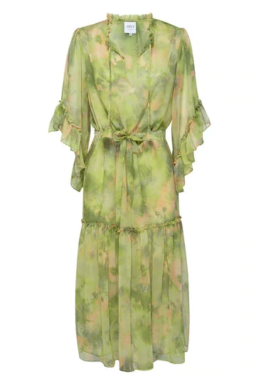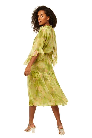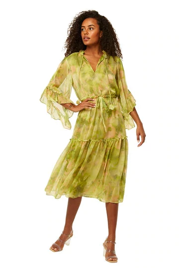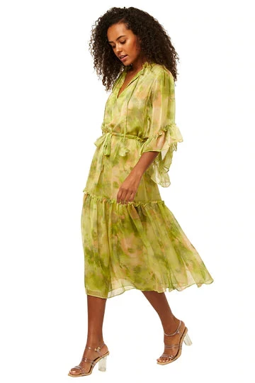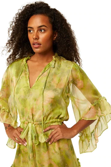 The Marcele is an effortlessly feminine midi silhouette cut from a gorgeous chartreuse abstract chiffon. Featuring an adjustable tie-waist, semi-sheer ruffle sleeves and an open neckline with our signature string petal ties.