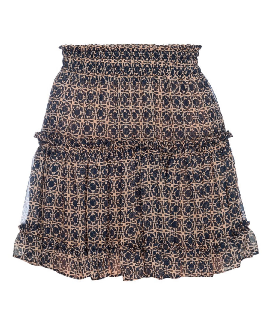 One of our signature silhouettes is back in a navy and tan tile print. This effortless piece is crafted from layers of romantic ruffles and features an elastic waistband that comfortably sits on the waist. A slightly curved hem and longer back accentuates the flattering silhouette that can be paired with everything from a plain tee to our coordinating Siena top.