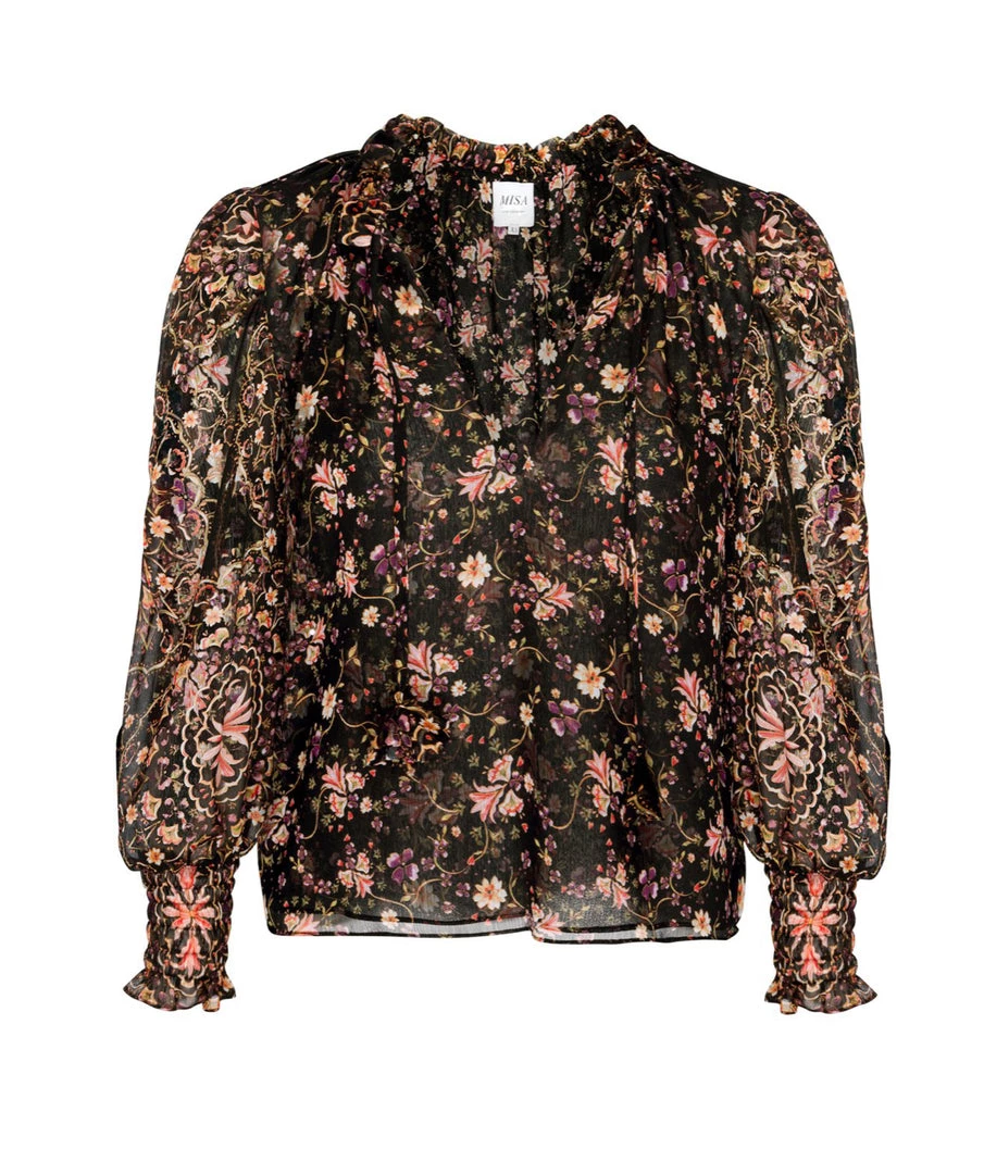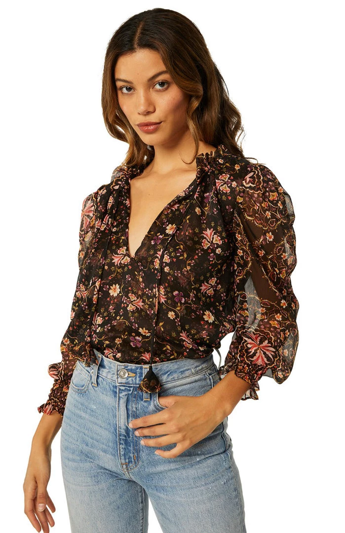 A classic top in a medallion chiffon print. A split-tie neckline with contrast ruffle trim and petal ties lead into long semi-sheer sleeves with wide, smocked elastic cuffs. Pair with the coordinating Marion skirt for the perfect set.