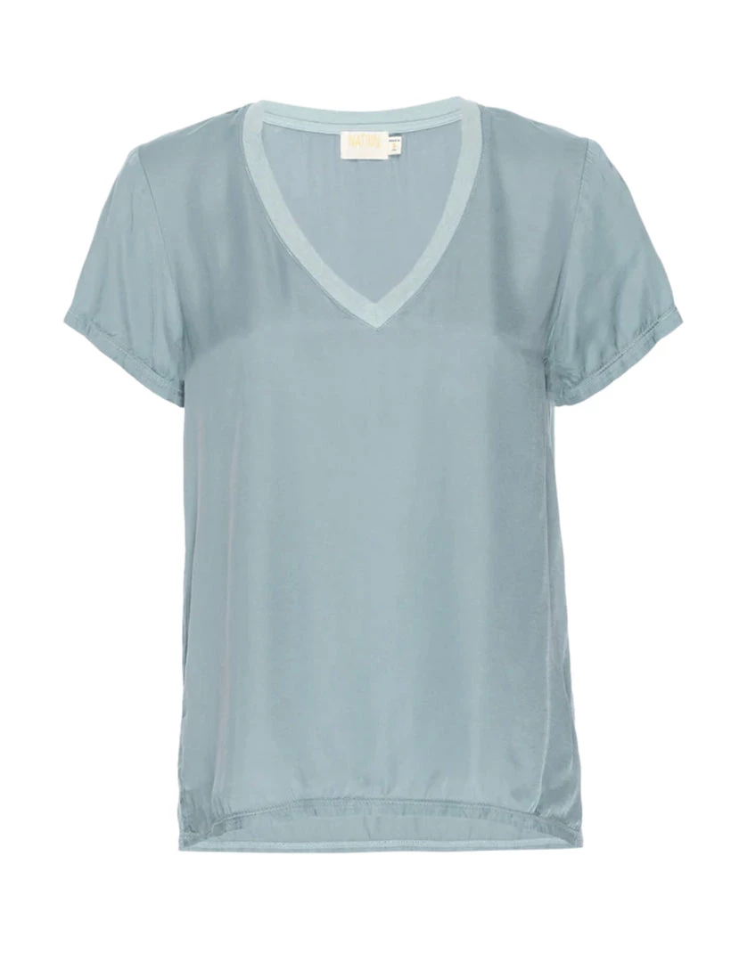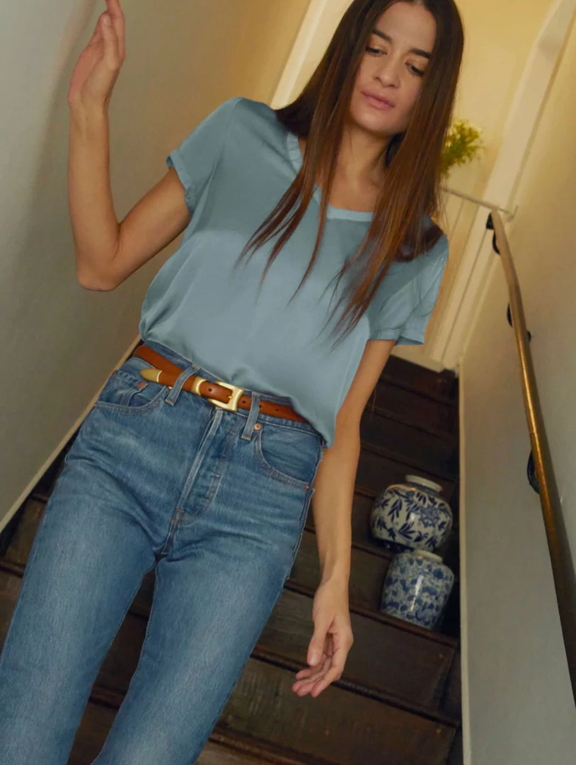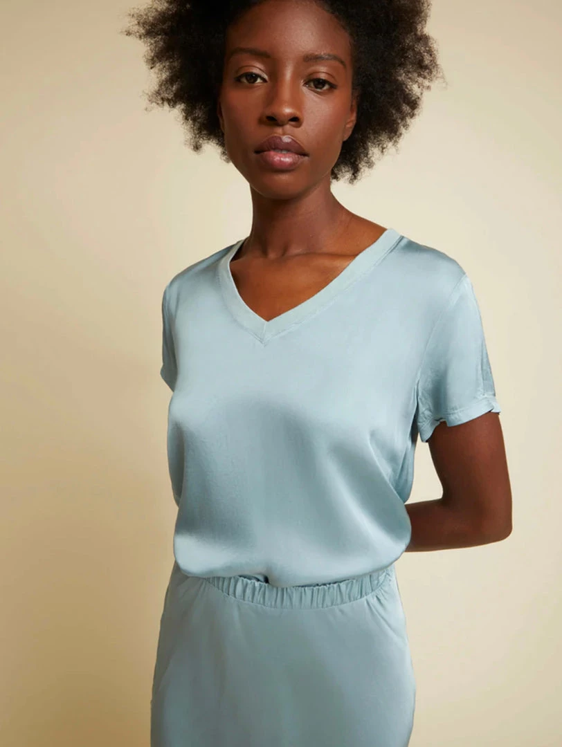 The V neck version of your favorite luxe Sateen tee with a laid-back Organic Cotton neckband. Sexy, effortless, and already a classic.