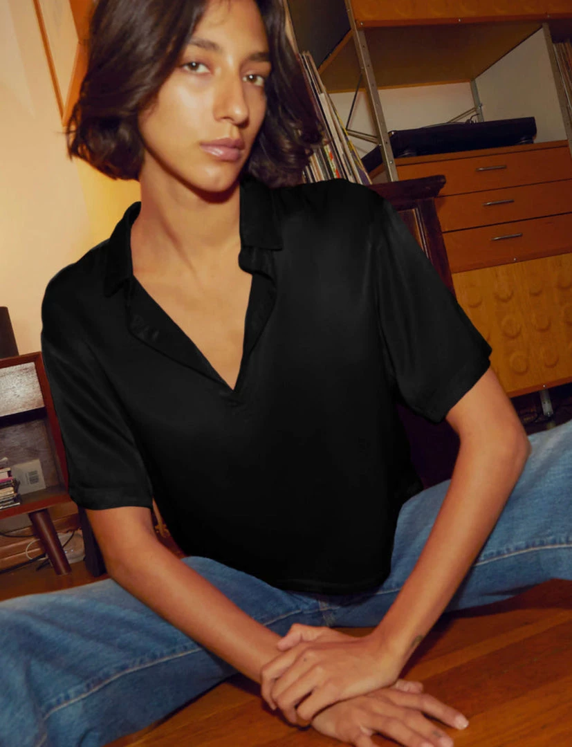 A retro style polo with a buttonless collar in luxe Hammered Satin. We’re obsessed with the dropped sholders and the cropped, boxy shape of this throwback style.