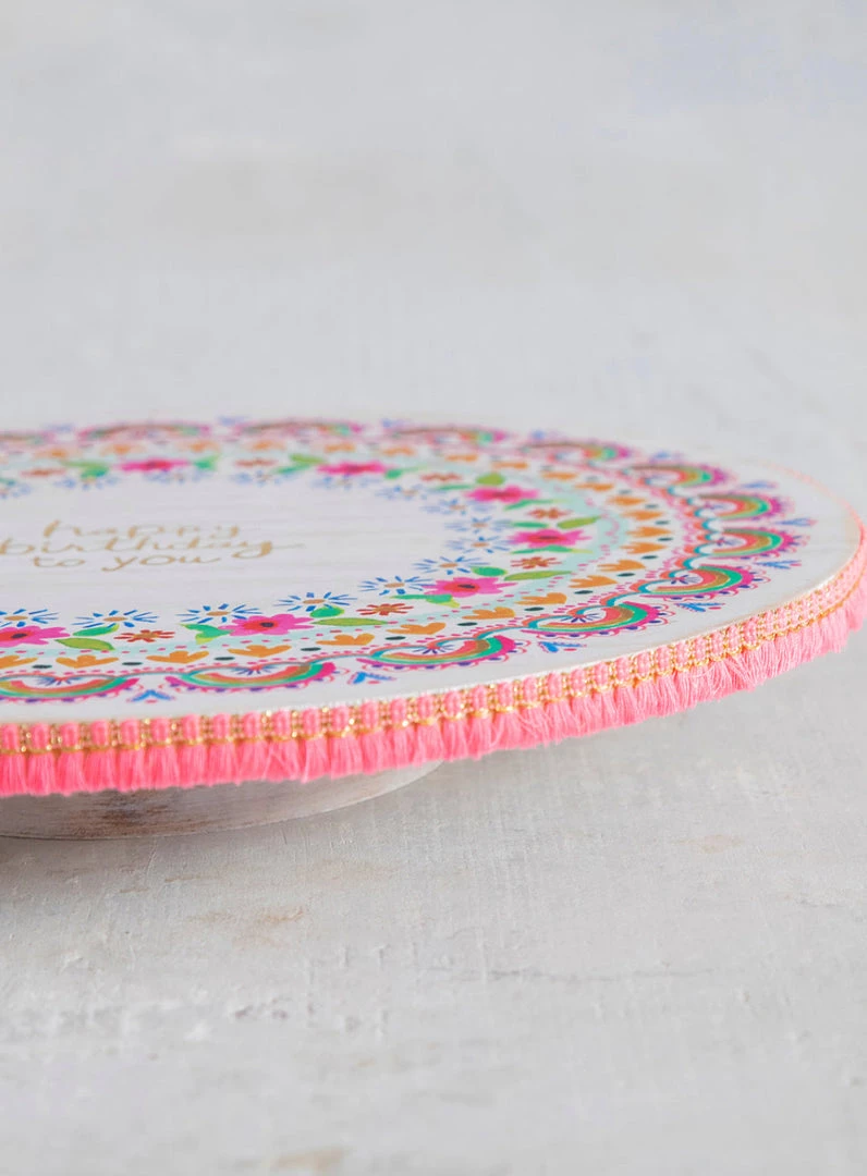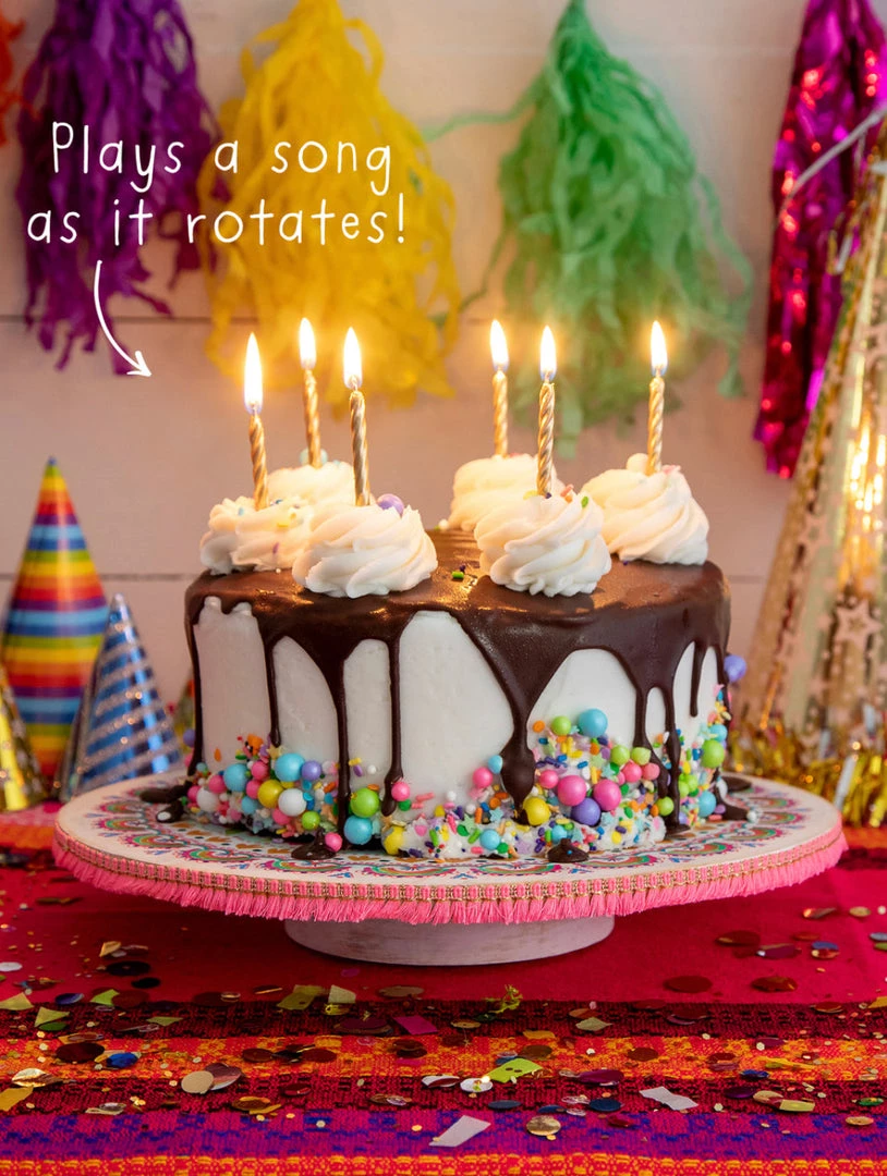 - Painted cake stand rotates while playing “Happy Birthday”. Gently wind the bottom clockwise to start the music