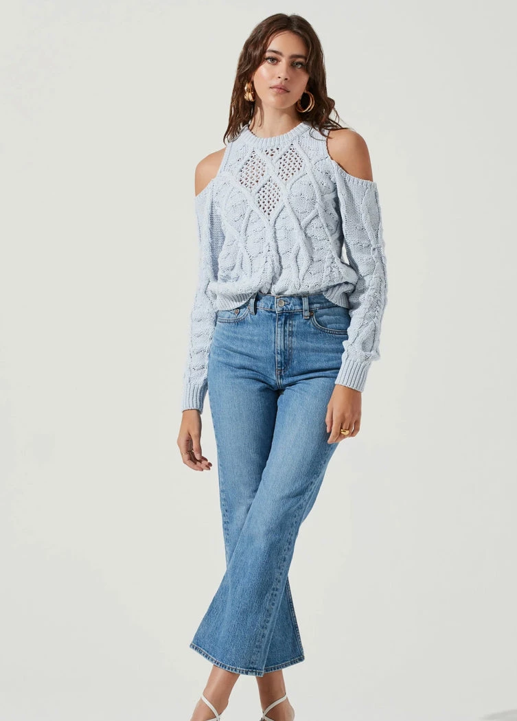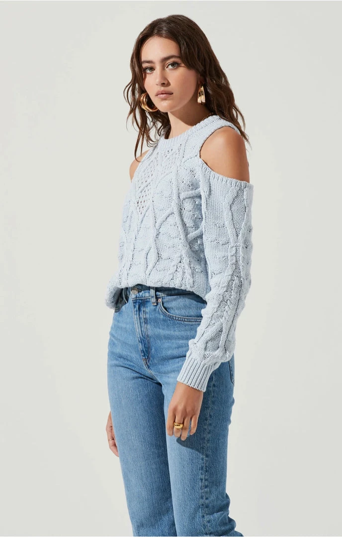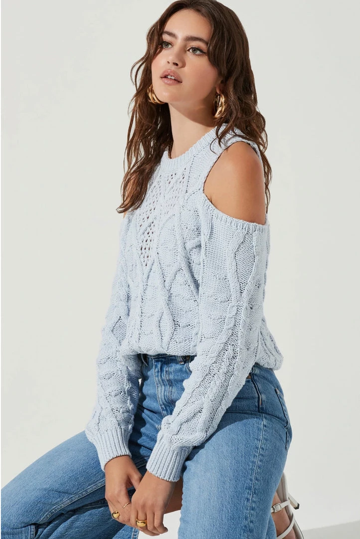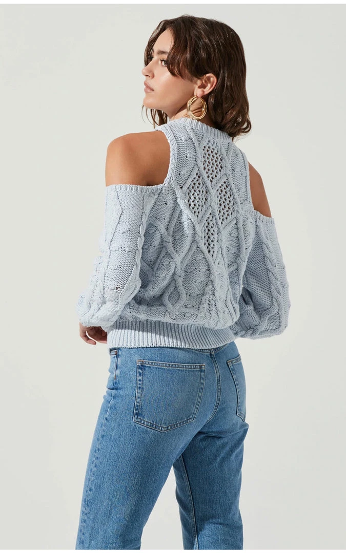 The Mar Vista Sweater features a round neckline that leads to cutout shoulders and a cable knit design. Long sleeves.