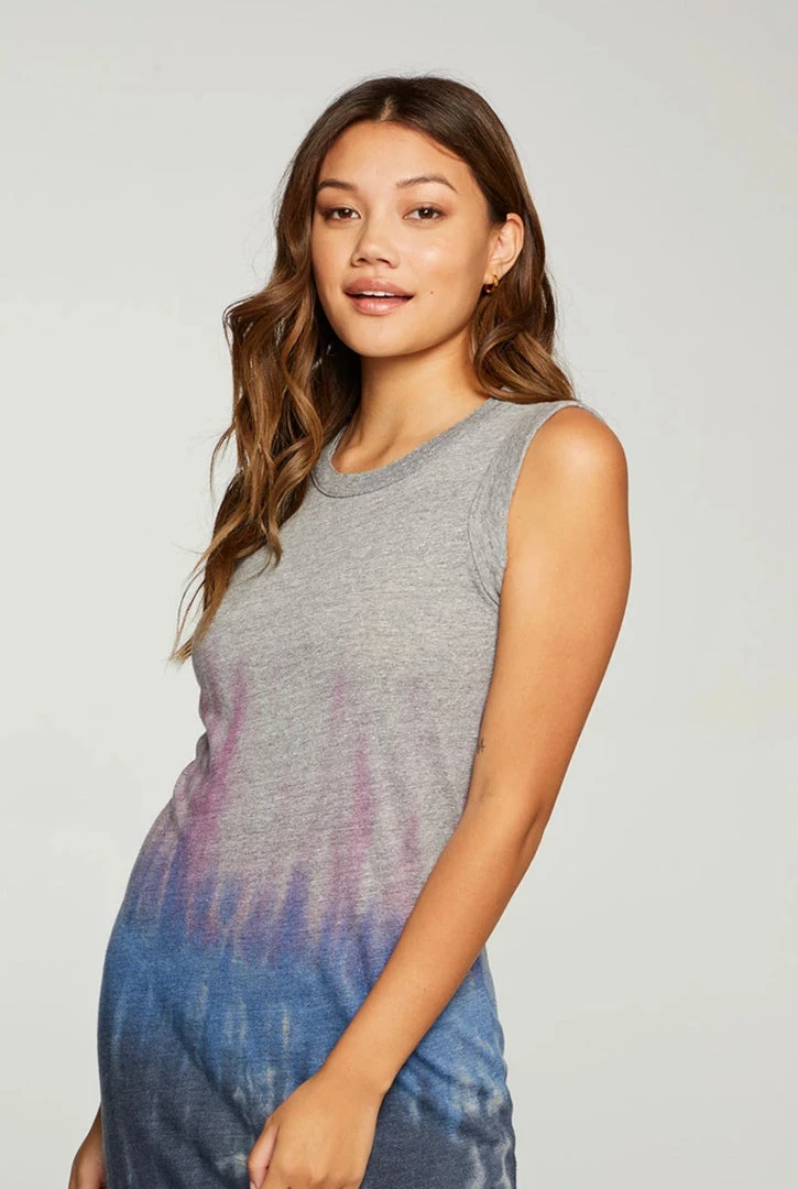 This armhole tank dress features an eye-catching tie-dye print, yet its jersey-knit, triblend material make it an easy, everyday wear.