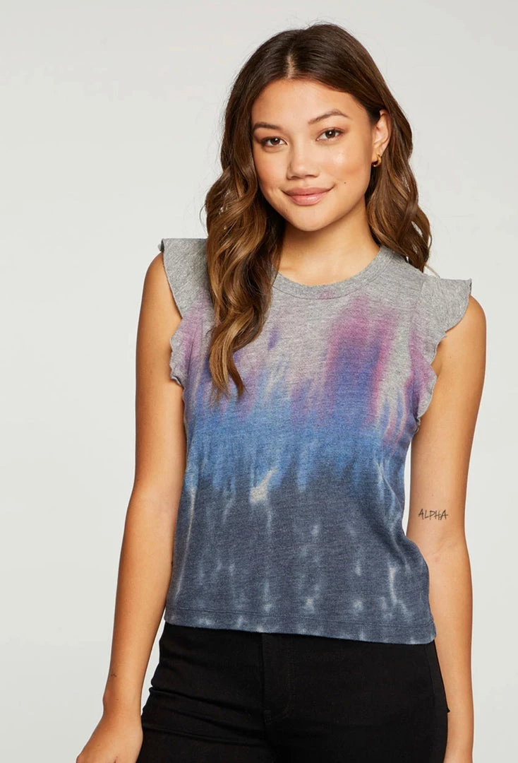 The bold tie-dye layers atop a lighter grey are the perfect color combo to ease you into spring.